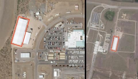 Satellite images taken on April 25, 2019 show rapid construction of migrant tent jails intended to house families and children at Border Patrol stations in El Paso and Donna, Texas.