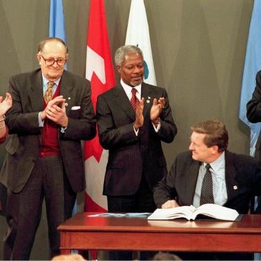 A total of 164 countries are party to the Mine Ban Treaty, which entered into force on March 1, 1999. Human Rights Watch chairs the International Campaign to Ban Landmines, 1997 Nobel Peace Laureate, together with Jody Williams.