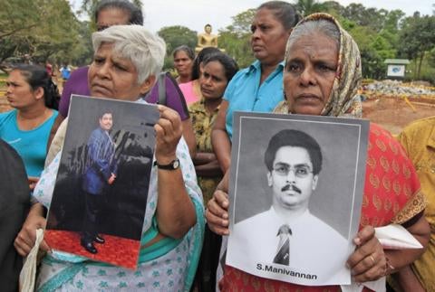 Sri Lankan Tamil women hold up photographs of their missing sons during a protest against the Sri Lankan government in Colombo on March 5, 2013. © 2013 Reuters