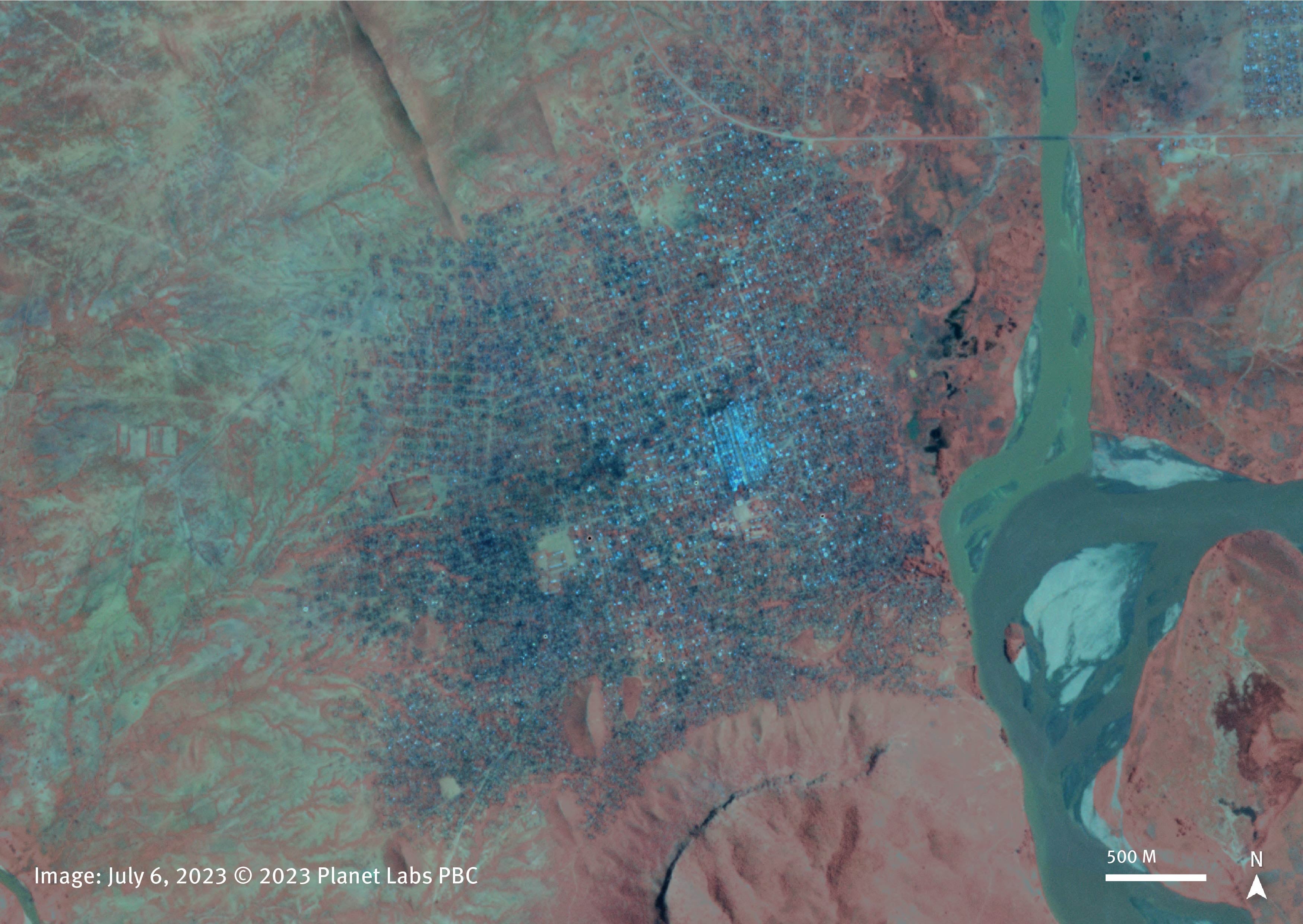 Active fires were visible in Murnei for five consecutive days, from June 27 through July 1. High resolution satellite imagery from June 30 shows burned residential areas and smoke plumes rising from the town.