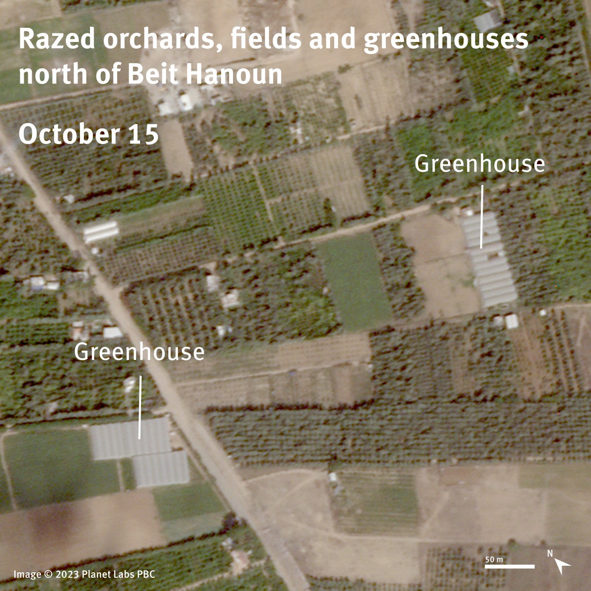 Since mid-November, after Israeli forces took control of the same area in northeastern Gaza, satellite imagery shows that orchards, fields, and greenhouses have been systematically razed, leaving sand and dirt. Human Rights Watch contacted the Israel Defense Forces for comment on December 8 but has not received a response.