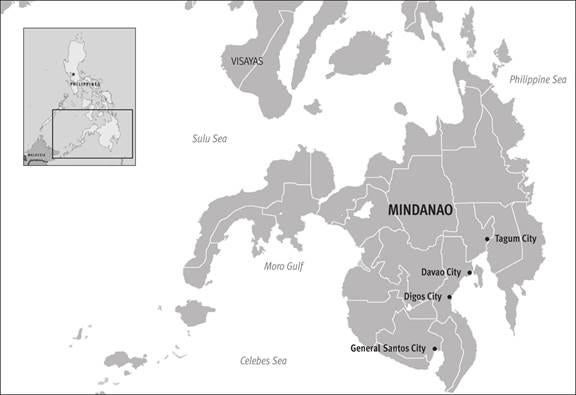 Map of cities in Mindanao with reported targeted killings of suspected criminals. © 2009 Human Rights Watch