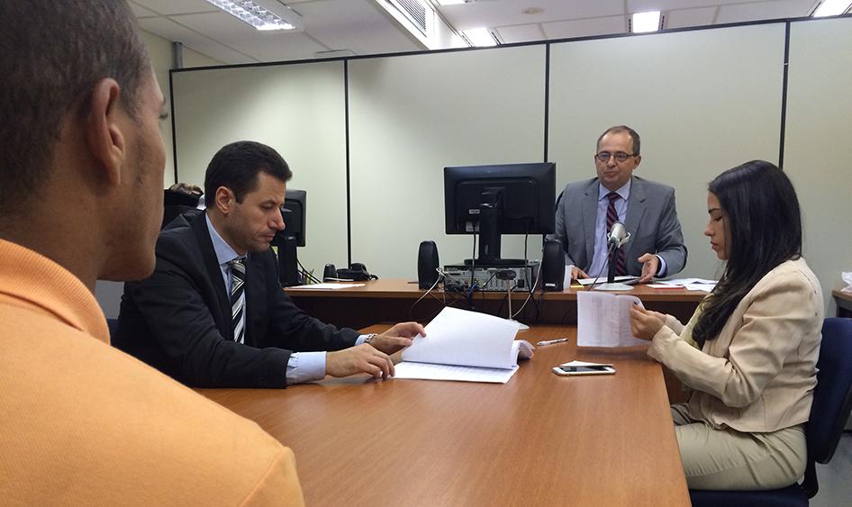 Um juiz promove uma audiência de custódia em São Paulo, com a participação de um promotor e uma defensora pública. 11 de maio de 2015.