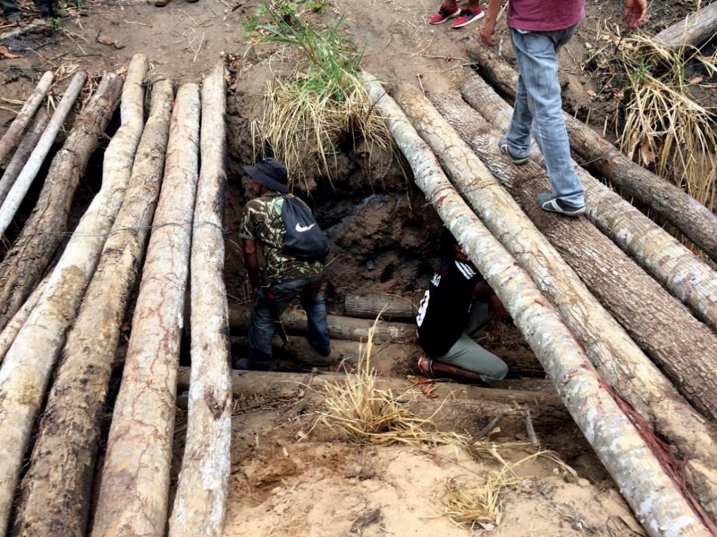 Os guardiões da floresta do povo Pyhcop Catiji encontram uma ponte feita por madeireiros para acessar madeira dentro da Terra Indígena Governador, no estado do Maranhão, em novembro de 2017. Foto de César Muñoz Acebes