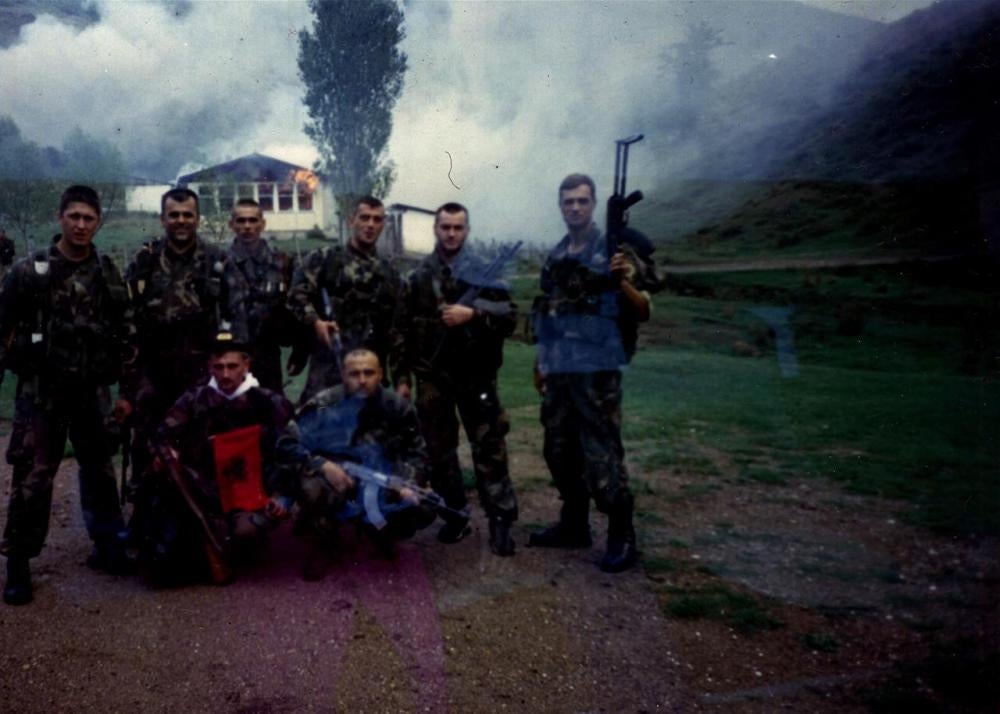 Vidomir Salipur is crouching in the front row, far left. The date and location of the photograph is unknown, as are the identities of the other men. © 1999 Fred Abrahams/Human Rights Watch 429497