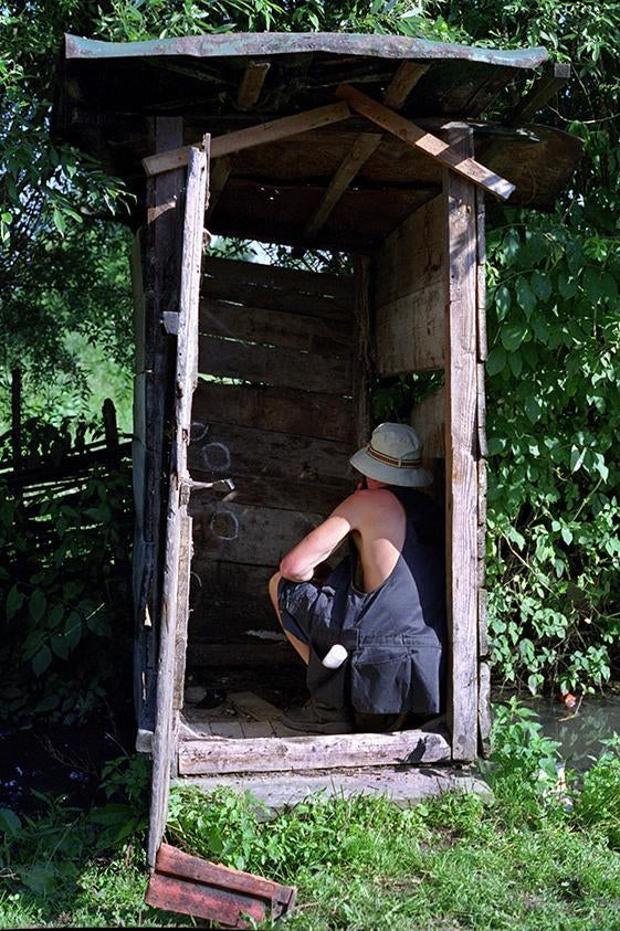 An investigator from the UN war crimes tribunal inspecting bullet marks in an outhouse in Cuska. © 1999 Fred Abrahams/Human Rights Watch 429497