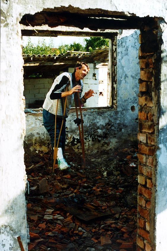 A survivor of the Cuska killings describes how he and other men were lined in this house up to be executed. © 1999 Fred Abrahams/Human Rights Watch 429497