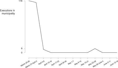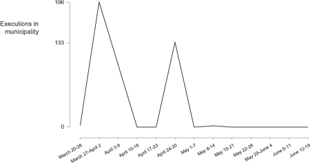 Likewise, the extrajudicial executions by municipality over time (Graphs 6 through 10, 14, and 15) show similar spikes in violence over short periods. Killing "sprees" tended to occur in municipalities over distinct periods, suggesting a strategic order to commit these killings in certain areas.