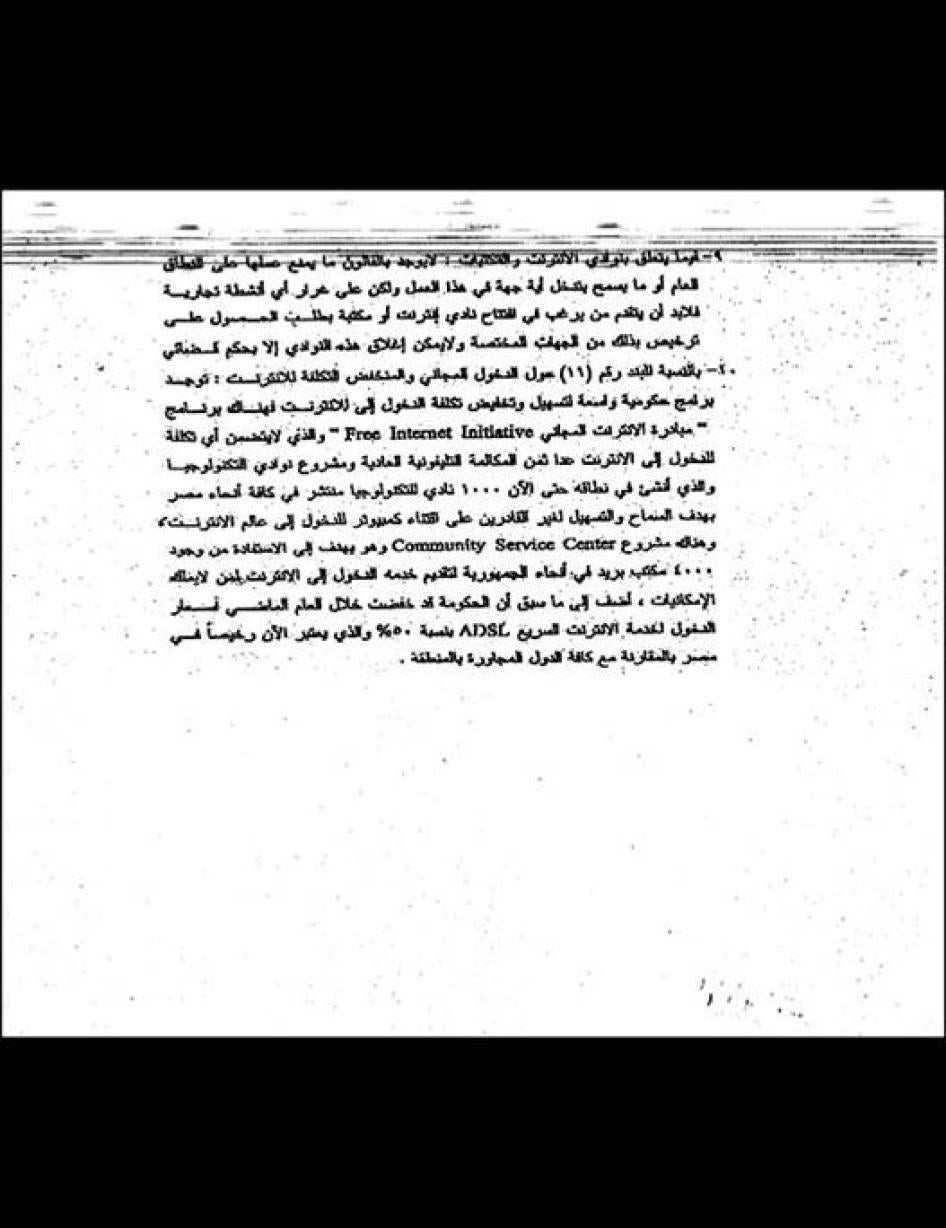 Speaking at the World Summit on the Information Society (WSIS) in 2003, President Mubarak called information technology a tool for "supporting national efforts toward more freedom, democracy, and respect of human rights."[35] At the Pan-Arab Conference on WSIS held in Cairo in May 2005, Prime Minister Ahmad Nazif told the assembled Arab and African leaders, "Knowledge and information have become-now more than ever-the main sources of prosperity and progress." But their status as such, he continued, rested on the principle that "access to and the free flow of information are basic human rights."[36]
