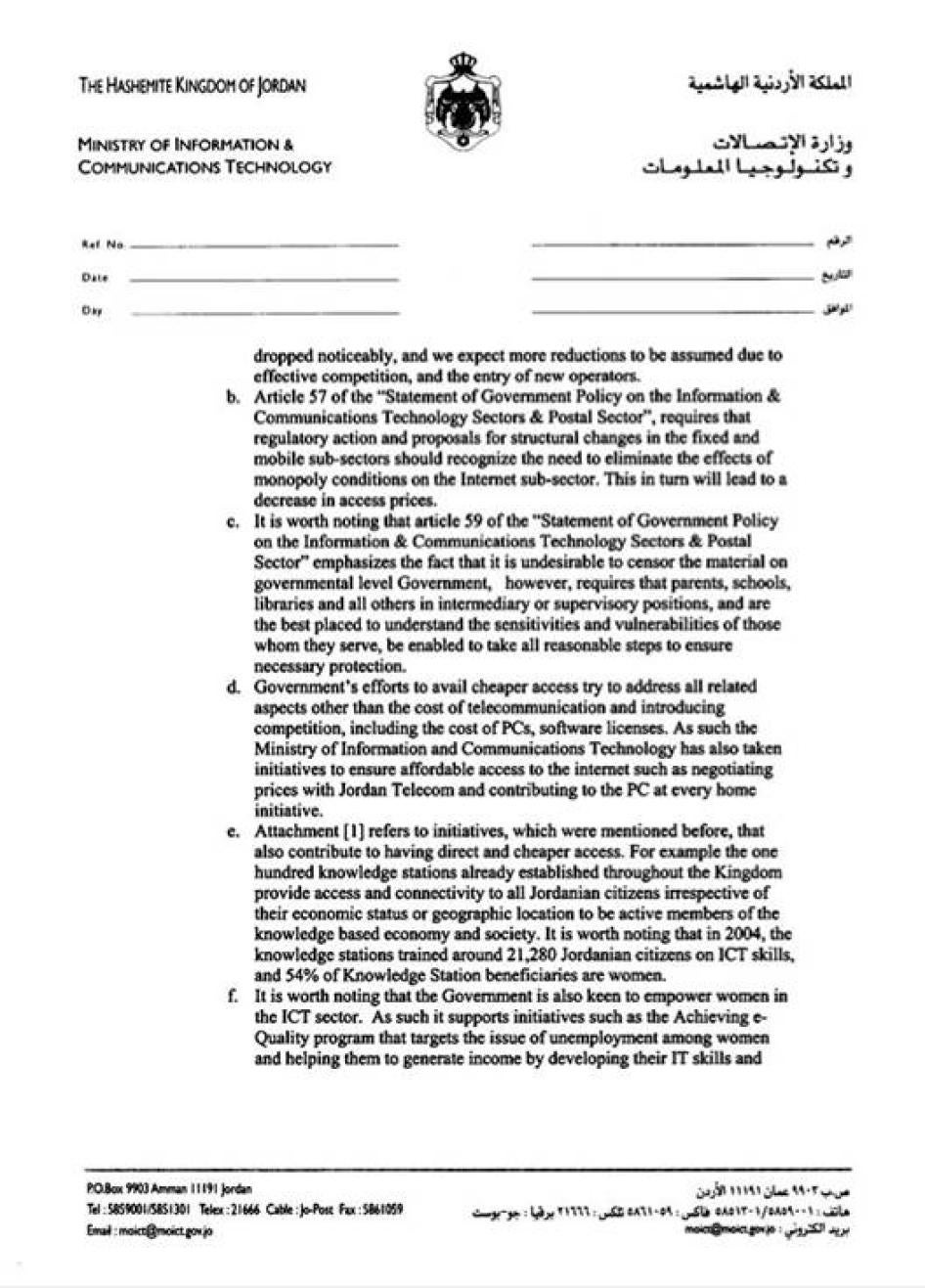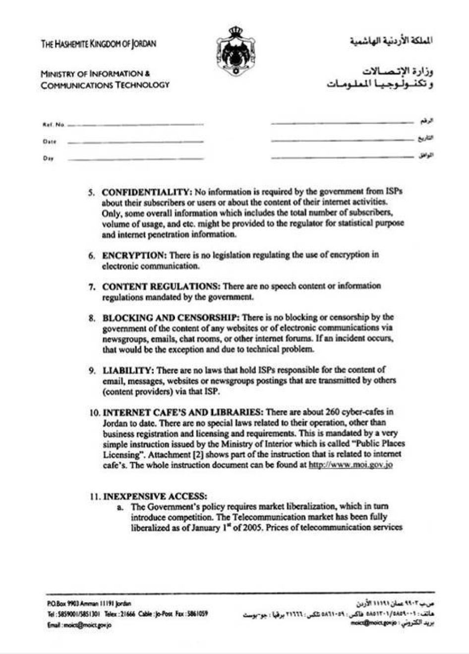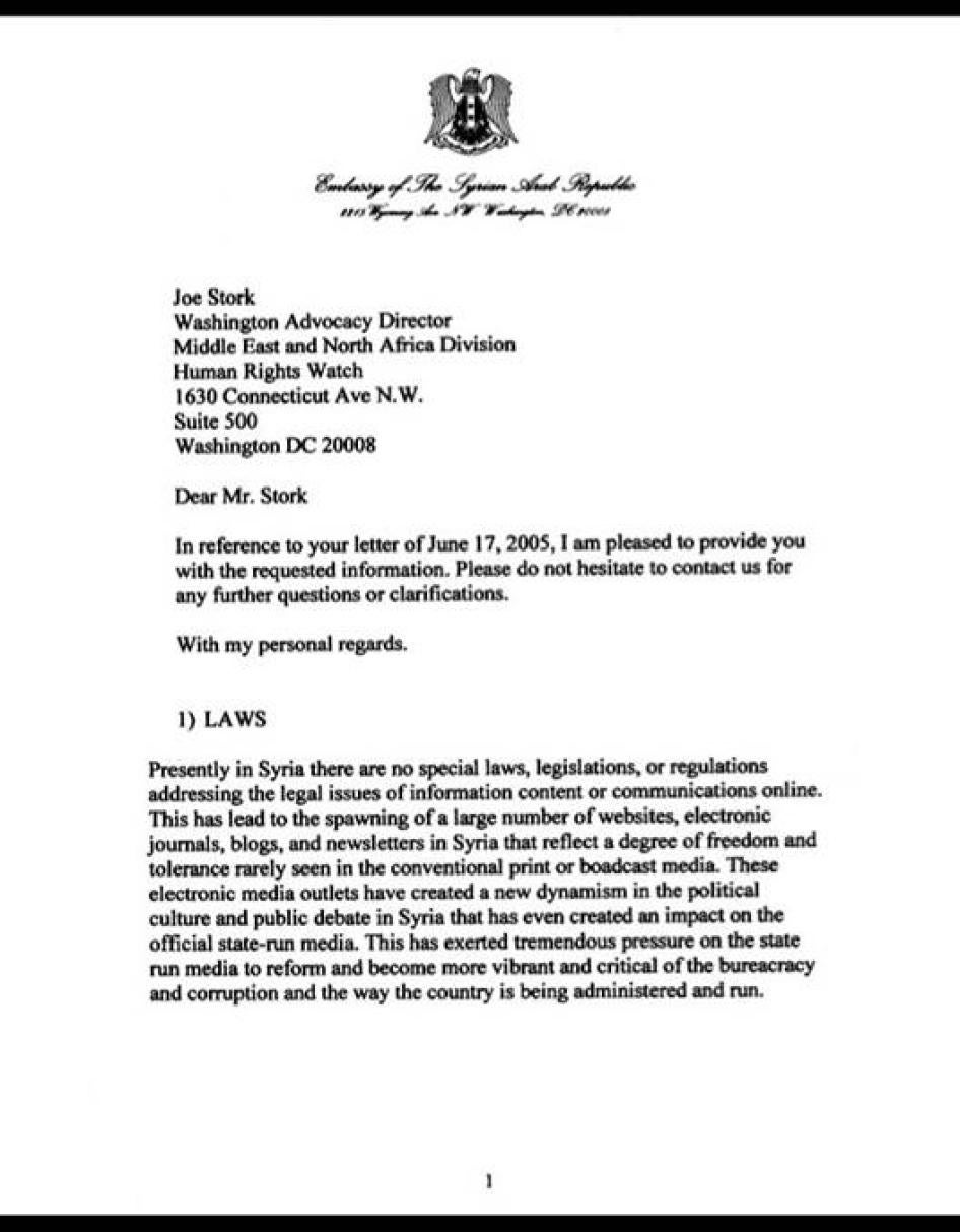 In preparing this current report, Human Rights Watch sent a similar letter (see Appendix A) to the governments of Bahrain, Egypt, Iran, Jordan, Saudi Arabia, Syria, Tunisia, and the United Arab Emirates. The governments of Egypt, Jordan, Syria, and Tunisia provided written responses, reproduced in Appendix B. The government of Iran directed Human Rights Watch to a Web site outlining some of its Internet policies. The government of Saudi Arabia acknowledged receipt of the letter but did not offer any further response. The governments of Bahrain and the United Arab Emirates did not reply.