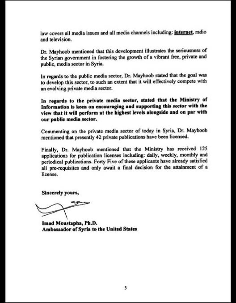 [307] Amnesty International and Reporters sans frontières have said the paper was based in the United Arab Emirates. Syrian publisher and women's rights activist Ma`an `Abd al-Salam told Human Rights Watch in an August 23, 2005, telephone interview that the paper was Kuwait's al-Siyasa.