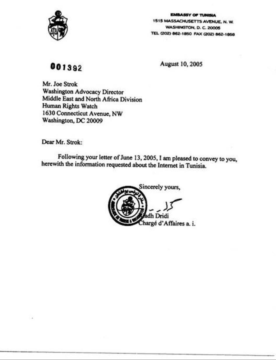 [339] Letter from Riadh Dridi, chargé d'affairs a.i. at the Embassy of Tunisia to the United States, to Human Rights Watch, August 10, 2005.