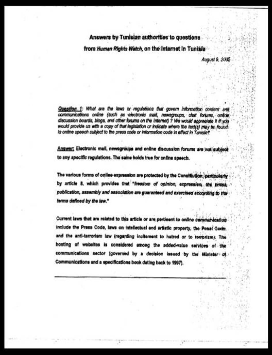 [347] See Human Rights Watch, The Internet in the Mideast and North Africa: Tunisia,http://hrw.org/advocacy/internet/mena/tunisia.htm.