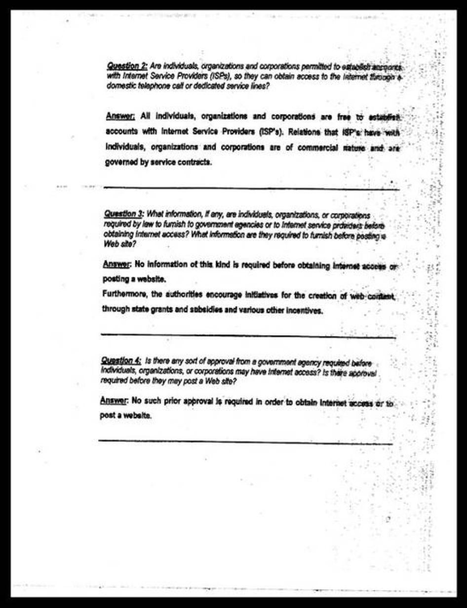 In 1999, Human Rights Watch sent a uniform letter containing questions about Internet policies to seventeen regional governments. The official responses to that query were reproduced and analyzed in Human Rights Watch's 1999 report, The Internet in the Mideast and North Africa.[17]