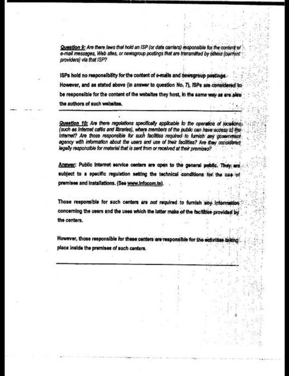 [359] Letter from Chargé d'Affairs Dridi to Human Rights Watch. Tunisia, in a letter sent in 2000 to the U.N. Commission on Human Rights, denied that the Press Law applies to the Internet. See letter dated May 26, 2000, from the Permanent Representative of Tunisia to the United Nations Office at Geneva, addressed to the United Nations High Commissioner for Human Rights, July 14, 2000, E/CN.4/2001/4, attaching the reply of the Tunisian Government to the report of the Special Rapporteur: "In referring to Internet access, it is regrettable that the Special Rapporteur misinterpreted certain legal texts. He states, without any basis in legal precedent or administrative regulations, that the regime of responsibility laid down by the Press Code is applicable to the Internet." http://www.unhchr.ch/Huridocda/Huridoca.nsf/0/f70f1154a1429481c12569ac004f22ee/$FILE/G0014311.doc, accessed October 4, 2005.