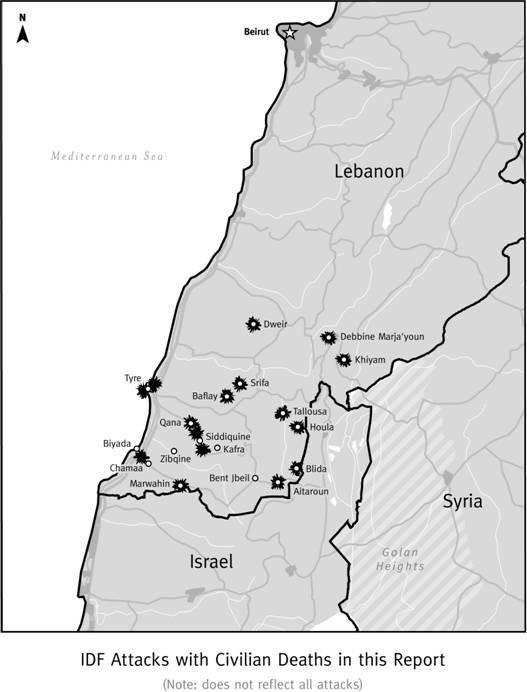 Security conditions did not permit on-site visits to many of the villages or other sites where civilian casualties are documented in this report, but in all cases Human Rights Watch located eyewitnesses to attacks.All cases for which Human Rights Watch could not find eyewitnesses, survivors, or other credible sources of information have been excluded from this report.A parallel team of Human Rights Watch researchers operated during this same period in northern Israel investigating and reporting on Hezbollah's attacks on civilians in Israel.That team also contributed to Human Rights Watch's understanding of IDF operations in Lebanon through on-site observations and conversations with IDF spokespersons.