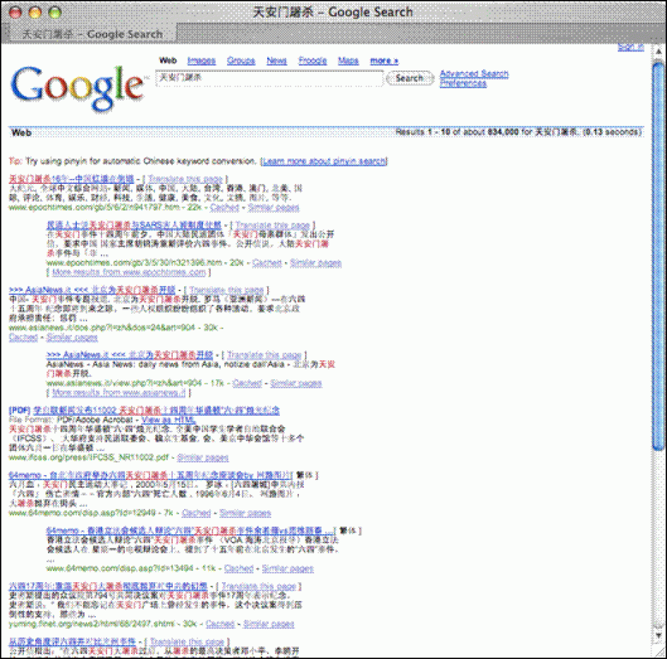 [115] OpenNet Initiative, "Google.cn Filtering: How It Works," blog, January 25, 2006, http://www.opennetinitiative.net/blog/?p=87 (retrieved July 12, 2006).