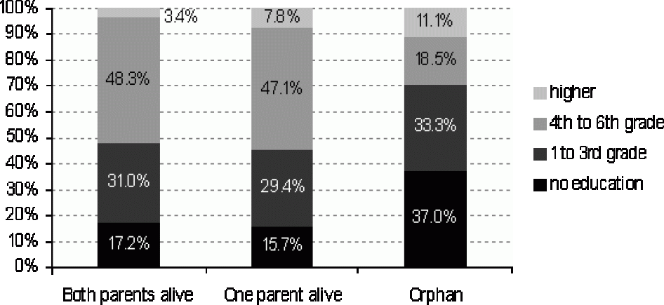 Data from the 136 children interviewed in Mpimba Prison suggest that orphans work more frequently as domestics than other children: 41 percent of the orphans worked as domestics prior to incarceration compared to 29 percent among children with both parents alive and 26 percent among children with a single parent. In addition, 46 percent of those accused of rape worked as domestics prior to their incarceration, more than among any other type of occupation. The data further suggest that orphans were more frequently in jail as a result of having been accused of rape compared to the other groups.