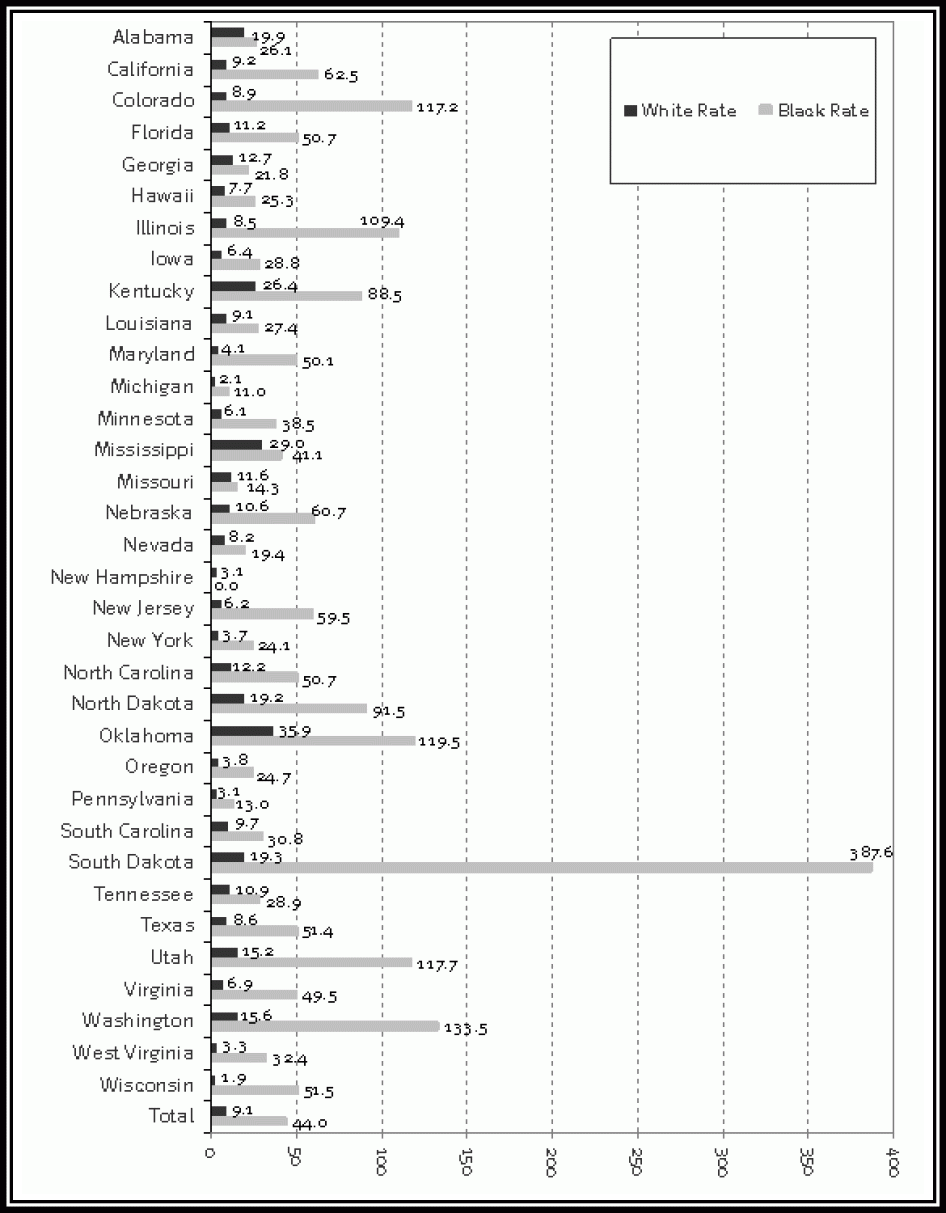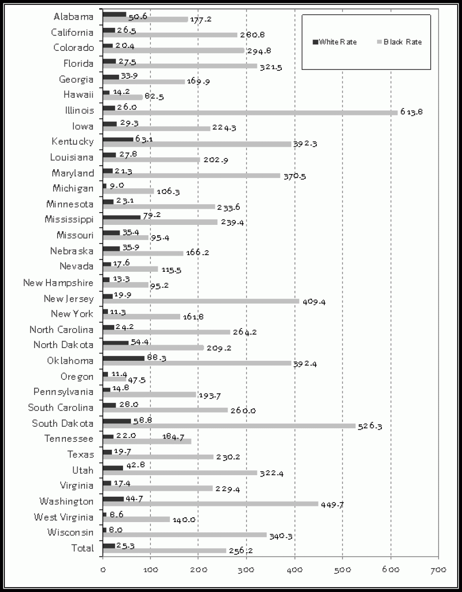 [48] In 1986 the rate of admission for blacks for drug offenses was 49 per 100,000 black adults, and for whites it was 9 per 100,000 white adults. Vincent Schiraldi, Barry Holman, and Phillip Beatty, The Sentencing Project, "Poor Prescription: The Costs of Imprisoning Drug Offenders in the United States," p. 7, http://www.cjcj.org/drug/ (accessed April 24, 2008). See also Pamela E. Oliver, Ph.D., "Racial Patterns in State Trends in Prison Admissions 1983-2003: Drug and Non-drug Sentences and Revocations," http://www.ssc.wisc.edu/~oliver/RACIAL/StateTrends/RacialPatterns_Intro_National.pdf (accessed February 19, 2008). Dr. Oliver uses data from the National Corrections Reporting Program to develop national and state-by-state graphs depicting prison admissions for participating states over a 20-year period.