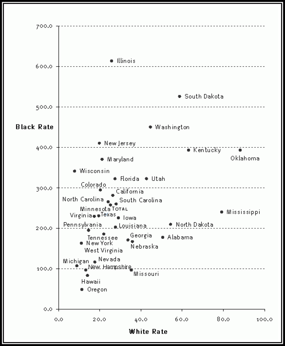 Fig.5: Correlation of White and Black Rates of Prison Admissions for Drug Offenses, 2003