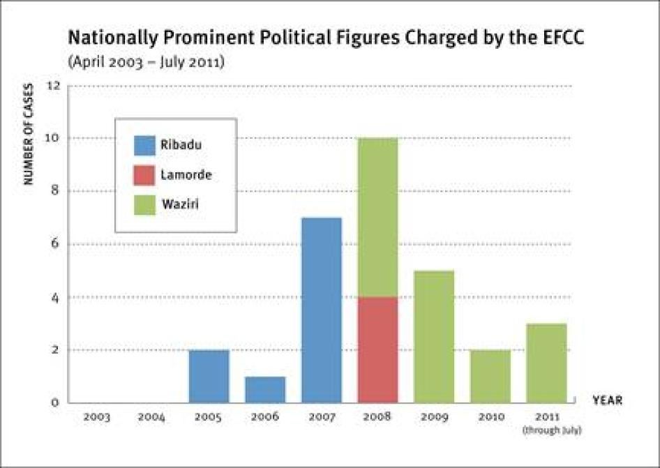 Since its inception, the EFCC has arraigned 30 nationally prominent political figures on corruption charges and has recovered, according to the EFCC, some US$11 billion through its efforts. But many of the corruption cases against the political elite have made little progress in the courts: there have been only four convictions to date and those convicted have faced relatively little or no prison time. Other senior political figures who have been widely implicated in corruption have not been prosecuted. At this writing, not a single politician was serving prison time for any of these alleged crimes. Despite its promise, the EFCC has fallen far short of its potential and eight years after its inception is left with a battered reputation and an uncertain record of accomplishment.