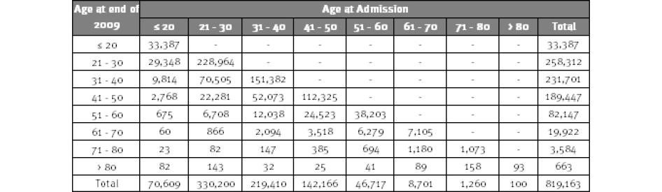 • Age: The NCRP data includes date of birth for each prisoner. We used the date of birth to determine prisoners’ ages as of year-end 2009. We computed the age at admission by comparing the date of admission with the date of birth. When the date of birth or date of admission was incomplete, but the available data clearly indicated that the individual was above or below 55 at admission, the record was categorized accordingly. We were unable to compute the age at admission for 2,742 prisoners (0.52 percent of the total number for whom we had records); we were also unable to compute the age in 2009 of 1,749 individuals (0.2 percent of the total number for whom we had records).