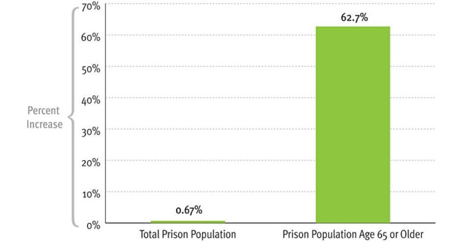 Perhaps the most dramatic indication of the surging number of older prisoners comes from data on the number of state and federal prisoners who are age 65 or older. In 2007 there were 16,100; by 2010 there were 26,200, an increase of 63 percent. Yet during that same time period, the total number of prisoners grew by 0.7 percent.[5]