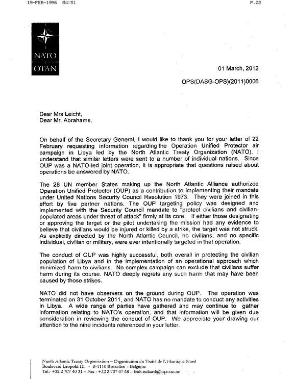 [48] Letter to Philippe Kirsch from NATO legal advisor Peter Olson, January 23, 2012, Report of the International Commission of Inquiry on Libya, Annex II.