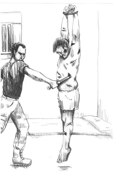 The mildest form of torture is hitting people with batons on their arms and legs and not giving them anything to eat or drink. Then they would hang the detainees from the ceiling by their hands, sometimes for hours or days. I saw it while I was talking to the interrogators. They used electric stun-guns and an electroshock machine, an electric current transformer. It is a small machine with two wires with clips that they attach to nipples and a knob that regulates the current. In addition, they put people in coffins and threatened to kill them and close the coffin. People were wearing underwear. They pour hot water on people and then whip them. I’ve also seen drills there, but I’ve never seen them being used. I’ve also seen them using martial art moves, like breaking ribs with a knee kick. They put pins under your feet and hit you so that you step on them. I also heard them threatening to cut off the detainees’ penises.