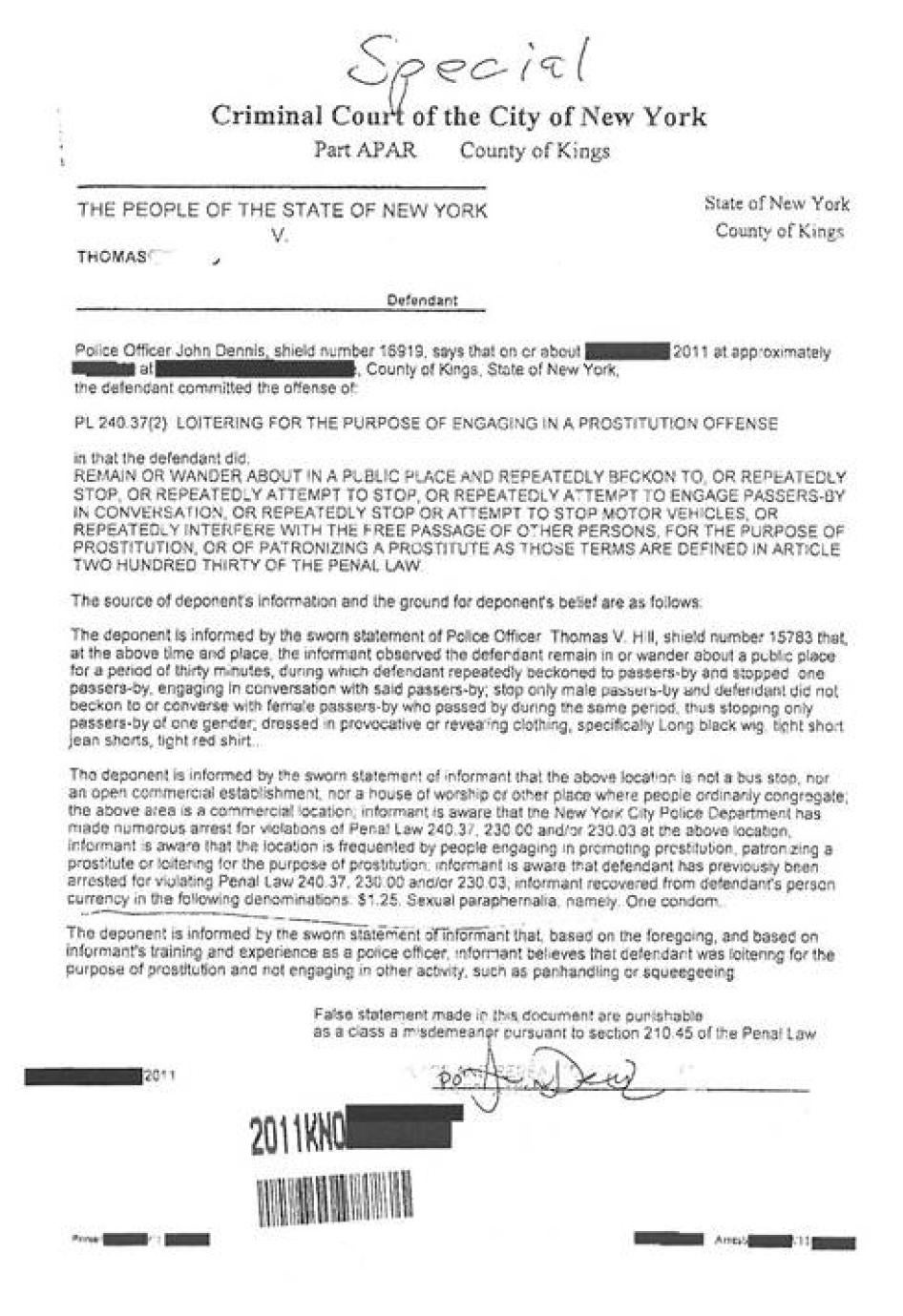 From January through November 2011 the New York City Police Department (NYPD) made 4,054 arrests for prostitution-related offenses.[31] This included 1, 899 prostitution cases (targeting the alleged provider of sex) and 1,192 arrests targeting alleged patrons of prostitutes. Six hundred and nineteen arrests were made for “loitering for the purpose of engaging in a prostitution offense.”[32]The vast majority of these arrests are disposed of without trial, primarily through plea bargaining or proceeding under a conditional discharge, usually requiring participation in a substance abuse or other “diversion” program.[33]