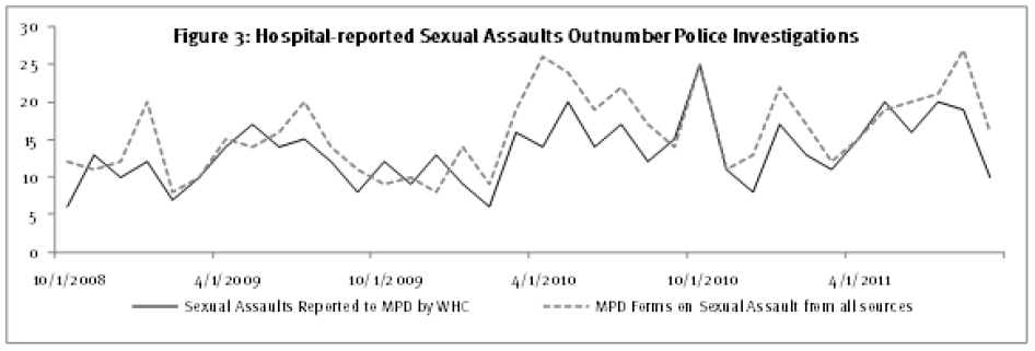 The problem may be even broader than these numbers suggest. Studies of police reports in Illinois and Los Angeles as well as a national sampling of victims indicate that at least 41 percent of victims who report an assault to the police do not get forensic exams. [13] If this trend holds true for D.C. as well, then we would expect the total number of incident reports at MPD to be significantly higher than the number of reports coming through the hospital. However, assuming the Washington Hospital Center data is correct, 436 victims had exams and reported to MPD in the 3 year period analyzed by Human Rights Watch (excluding 44 cases in which the victim reported to MPD at the hospital but did not have an exam). Over the same time period, MPD has 571 incident reports. [14] Even if all the hospital reports were accounted for at the MPD (as previously noted, at least 35.4 percent are not), the total number of reports at the MPD would still be far lower than expected. If approximately 41 percent of people who report to police do not have forensic exams, the number of MPD reports for sexual assault for that period would be expected to be 739 cases, not 571. [15]