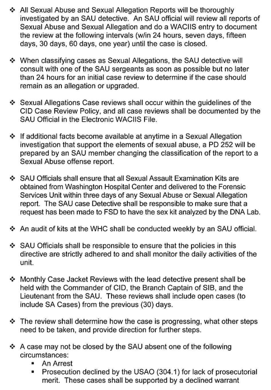 SOP: Standard Operating Procedures for the Sexual Assault Unit. These are the MPD’s guidelines for the investigation of sexual assaults.
