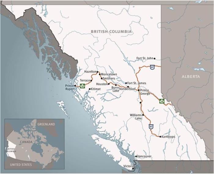 Human Rights Watch undertook the research on which this report is based after Justice for Girls (JFG), a Vancouver-based organization advocating for the rights of girls in British Columbia, submitted a briefing paper to Human Rights Watch in November 2011 describing human rights violations against indigenous teen girls in northern British Columbia.[5] In collaboration with JFG, Human Rights Watch conducted five weeks of field research in British Columbia in July and August 2012, most of which was spent traversing Highway 16 from Prince George to Prince Rupert, and Highway 97 between Prince George and Williams Lake. The Carrier Sekani Tribal Council passed a resolution welcoming Human Rights Watch into the territory and supporting the research. Human Rights Watch attended the annual general meeting of the Carrier Sekani and spoke with community members about police treatment of girls and women, and the murders and disappearances along Highway 16.
