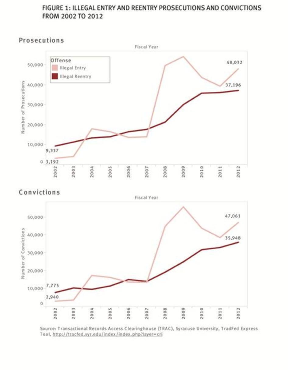 The criminal prosecution of illegal entrants has grown exponentially over the past 10 years. In 2002, there were 3,000 prosecutions for illegal entry and 8,000 for illegal reentry; a decade later, in 2012, these prosecutions had increased to 48,000 and 37,000, respectively. These cases now outnumber other frequently prosecuted federal offenses such as drug, firearm, and white-collar crimes.