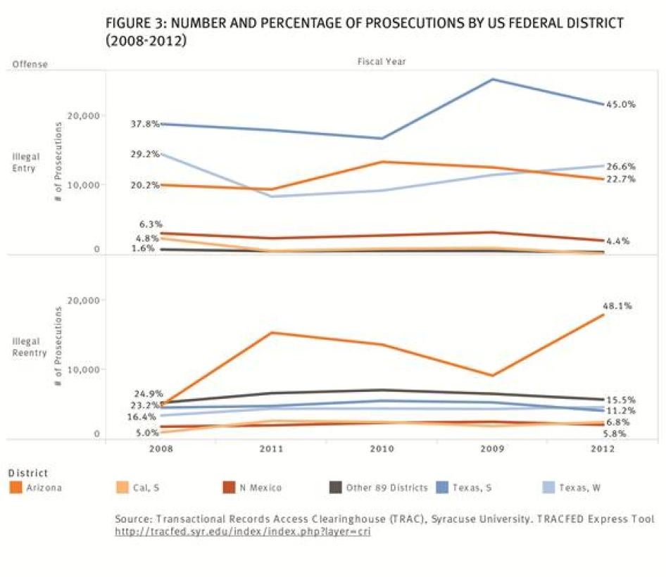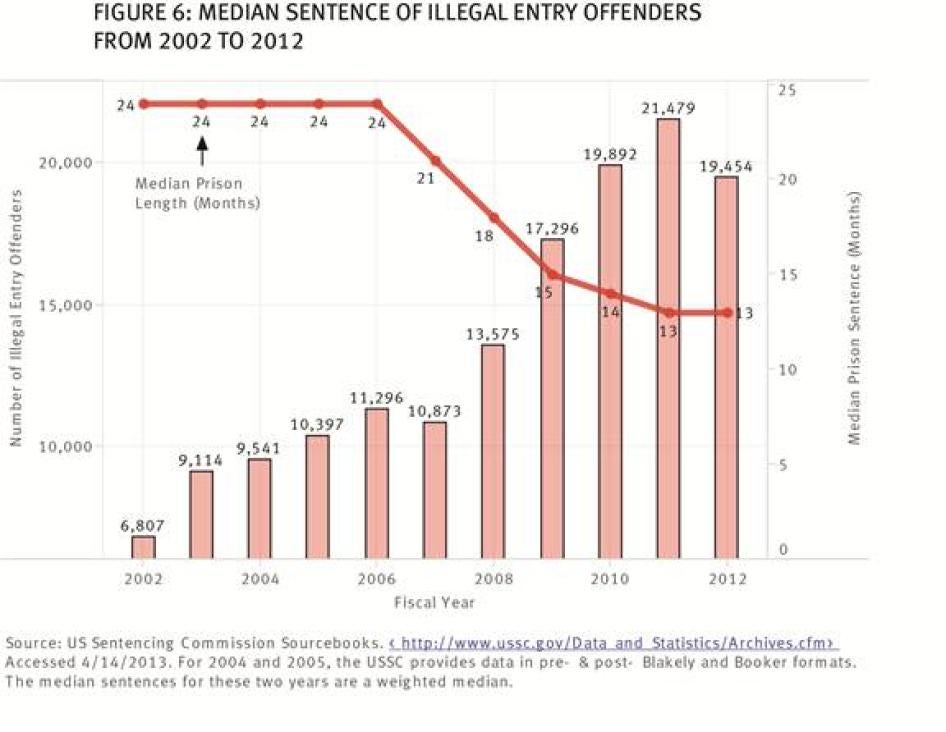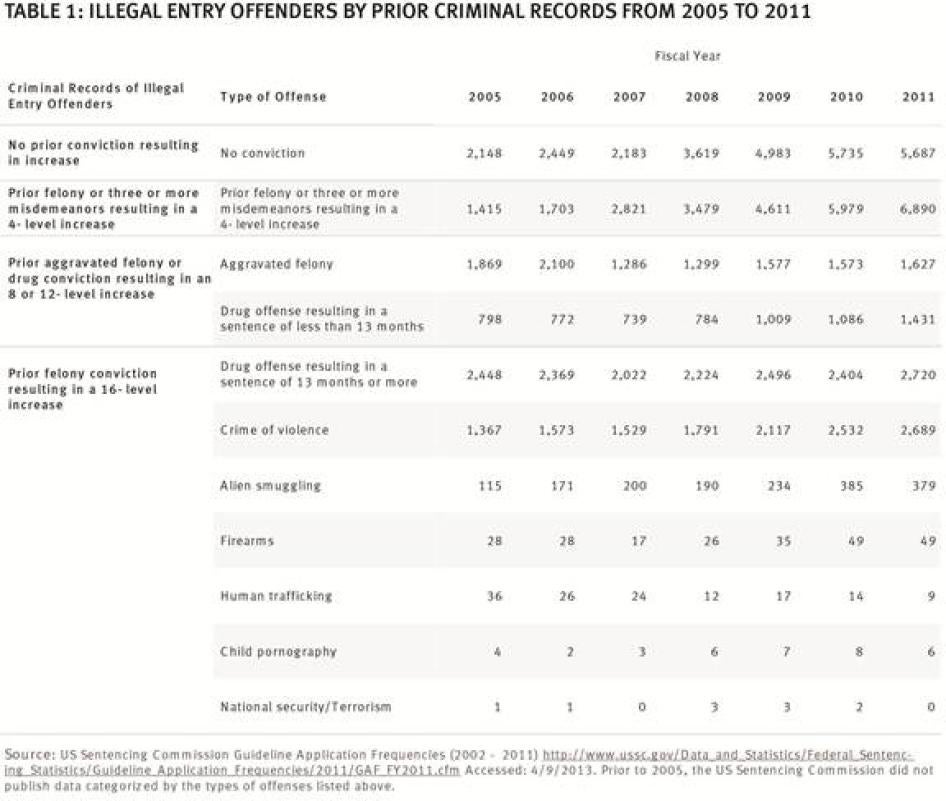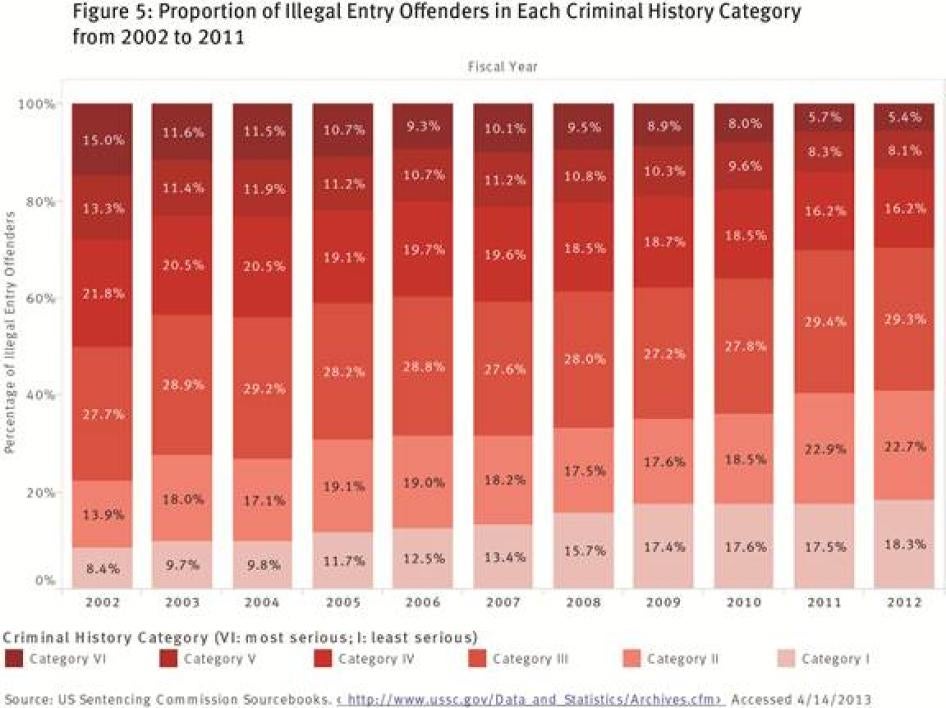 Human Rights Watch is still awaiting responses to requests under the Freedom of Information Act for data from US Customs and Border Protection (CBP) and ICE, as well as a response to a request for information from the US Department of Justice (DOJ), on the criminal records of defendants charged with illegal entry and reentry from 2002 to the present. According to a recent Bureau of Justice Statistics report, only 20 percent of defendants charged with illegal reentry in 2010 had prior felony convictions for violent offenses. [40] An analysis of available data from the US Sentencing Commission (“the Commission”) indicates that this figure is part of a growing trend toward increased prosecution of immigrants with records, if they have records at all, for nonviolent or minor offenses.