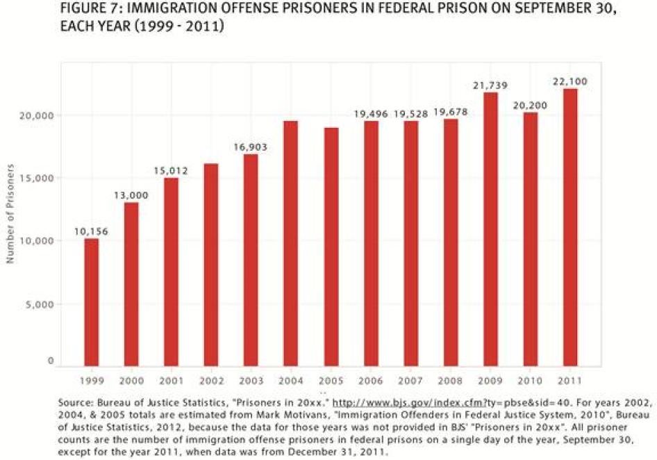[209] US Department of Justice, Office of Justice Programs, Bureau of Justice Statistics, “Pretrial Detention and Misconduct in Federal District Courts, 1995-2010,” February 2013, http://www.bjs.gov/content/pub/pdf/pdmfdc9510.pdf (accessed April 26, 2013). In 2000, immigration defendants comprised 22 percent of suspects in US Marshals custody. By 2010, they made up nearly half (46 percent) of suspects booked by US Marshals.