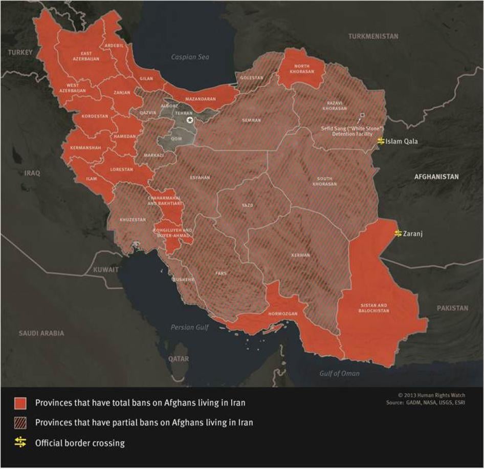 - Allow all foreign nationals in Iran freedom of movement without discrimination, and abolish the current unlawful “no go area” system which limits or prohibits non-citizens from living or traveling in 28 of the country’s 31 provinces.