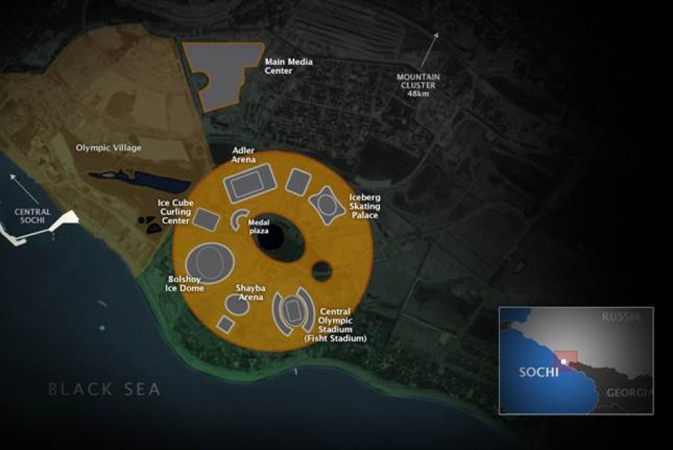 Sources: Google Earth, sochi2014.com; Sémhur; Satellite Image © 2013 DigitalGlobe; Image © 2013 Human Rights Watch