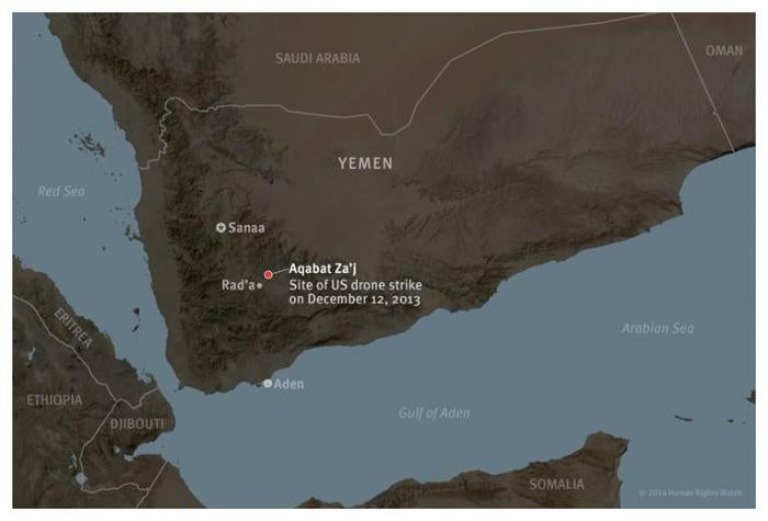 [25] Human Rights Watch interviews with eight relatives of those killed in the strike: Abdullah Muhammad al-Tisi; Saleh Mohsen al- `Amri ; Abdu Rabu Abdullah al-Tisi; Ahmad Muhammad al-Salmani; Talib Ahmad al-Tisi; Saleh Hussein Muhammad al- `Amri; and Aziz Mabkhut al-`Amry; all interviewed January 11, 2014, and Ali al-`Amri , interviewed by telephone from Sanaa to Rad`a, Human Rights Watch also confirmed this information with human rights defender Baraa Shaiban of Reprieve, Sanaa, January 11, 2014, and Yemeni journalist Nasser al-San`a, Sanaa, January 16, 2014, both of whom visited the scene.