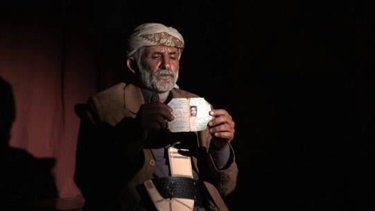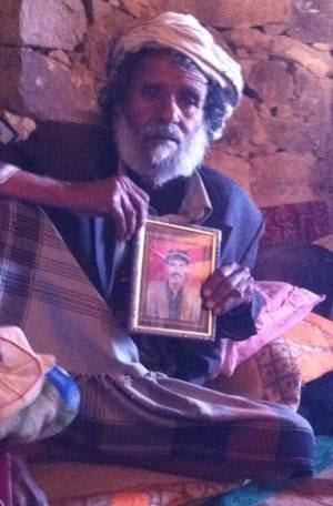 Ahmad Muhammad al-Tisi of Yakla holds a photo of his son `Aref Ahmad Muhammad al-Tisi, 28, who was killed in a US drone strike outside Rad`a, Yemen on December 12, 2013. © 2013 Nasser al-San`a |