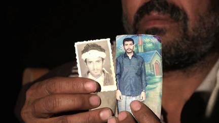 Saleh Mohsen al-`Amri of Yakla shows photos of nephew Shaif Abdullah Mohsen Mabkhut al-`Amri (left) and cousin Saleh Mes`ad Abdullah al-`Amri, who were killed in a US drone strike outside Rad`a, Yemen, on December 12, 2013. © 2013 Human Rights Watch |