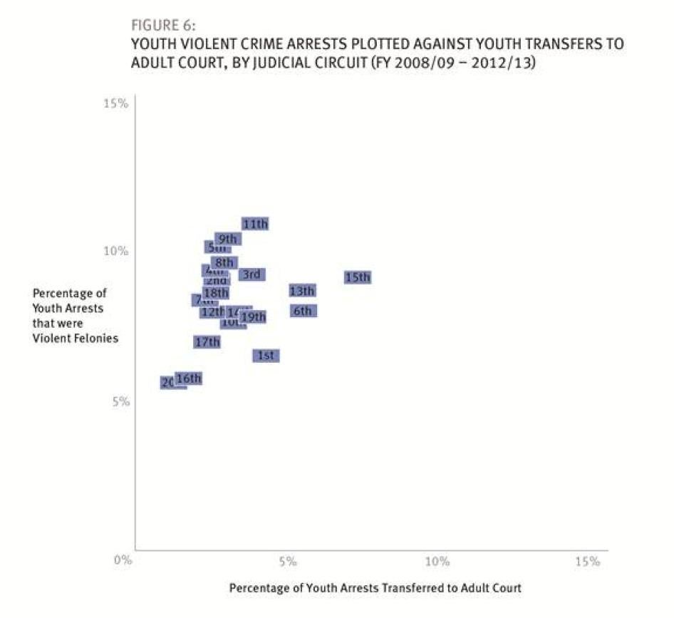 As noted above, new statistics developed by Human Rights Watch for this report show that the overwhelming power Florida has handed to prosecutors is playing out in arbitrary and unjust ways. Florida’s judicial circuits send arrested children to adult courts at vastly different rates. This variation cannot be explained by the seriousness of offenses, the size of circuit youth populations, or other data Human Rights Watch examined. Even more disturbingly, once children are charged in adult court, some Florida circuits impose severe adult penalties at frequencies that are out of proportion to the levels of youth crime in those circuits.