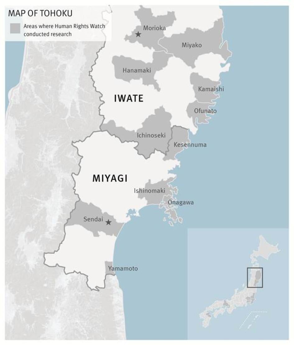 Out of the 202 interviewees, 61 are from the Tohoku region. Human Rights Watch visited Tohoku four times, in December 2011, and in May, June, and August of 2012. We visited cities and towns devastated by the 2011 earthquake and interviewed earthquake orphans, care givers taking care of the orphans, local government officials, and representatives of civil society organizations.