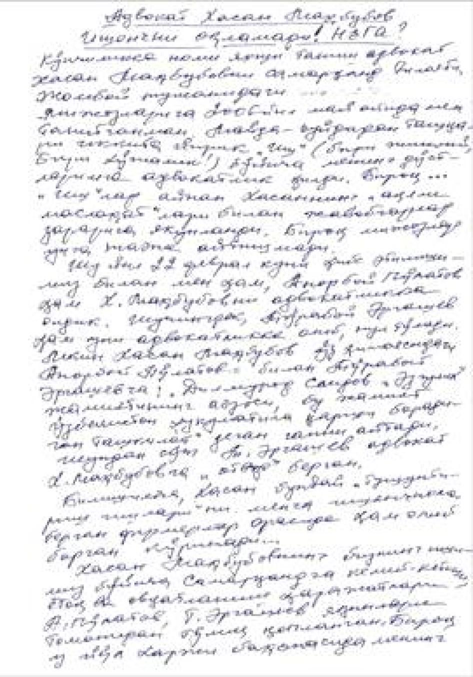 [327] “Uzbekistan: Recent Religious Extremism and Terrorism Convictions,” Wikileaks, April 13, 2009, http://cablegatesearch.net/cable.php?id=09TASHKENT497&q=irmoq (accessed September 11, 2014); Ali Yunusov, “Tashkent Appellate Court Upheld Sentence against Founders and Publishers of a Popular Journal,” Voice of Freedom Regional Human Rights Portal, March 31, 2009, http://vof.kg/?p=3119 (accessed September 11, 2014). Tojiev was tried separately and sentenced by the same court on April 8, 2009.