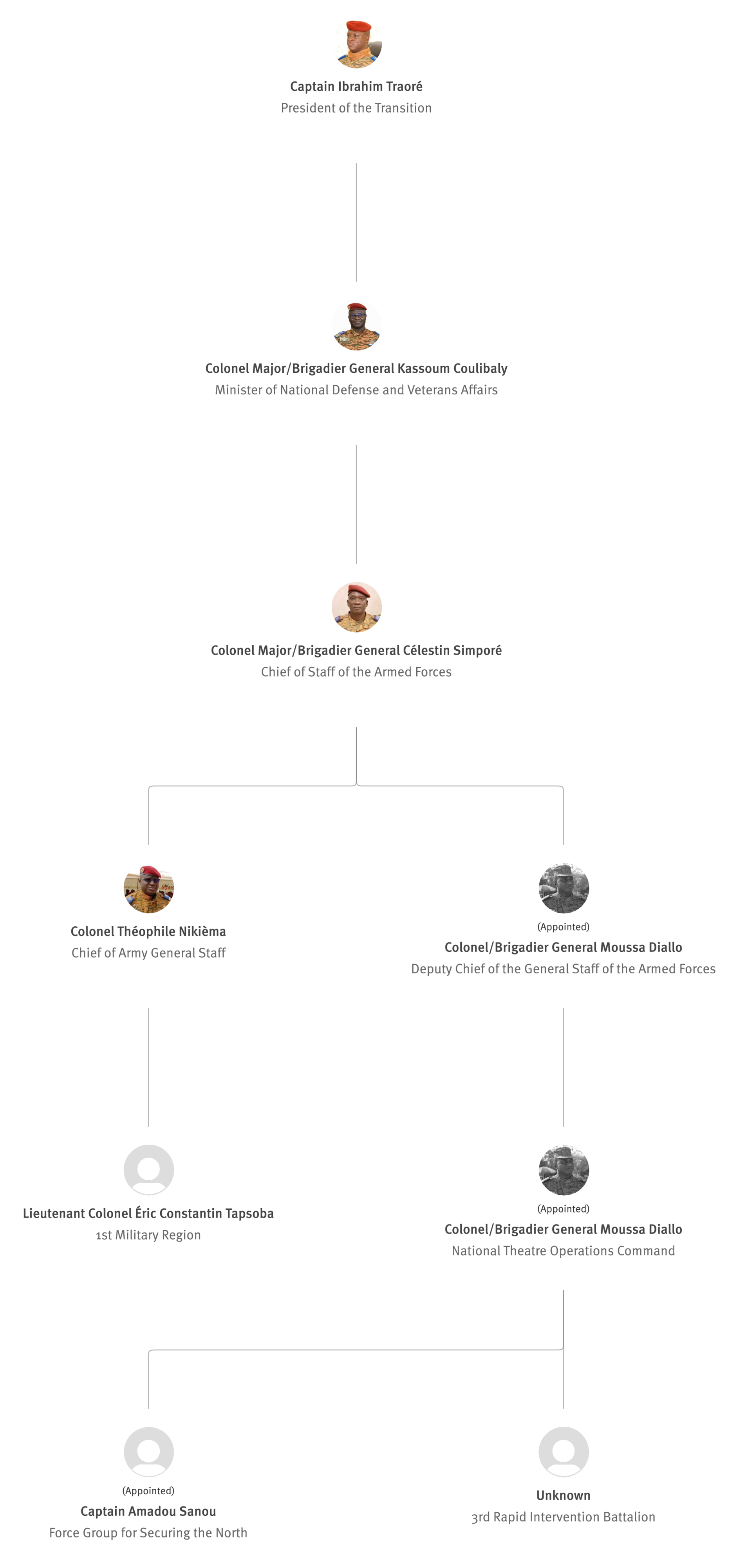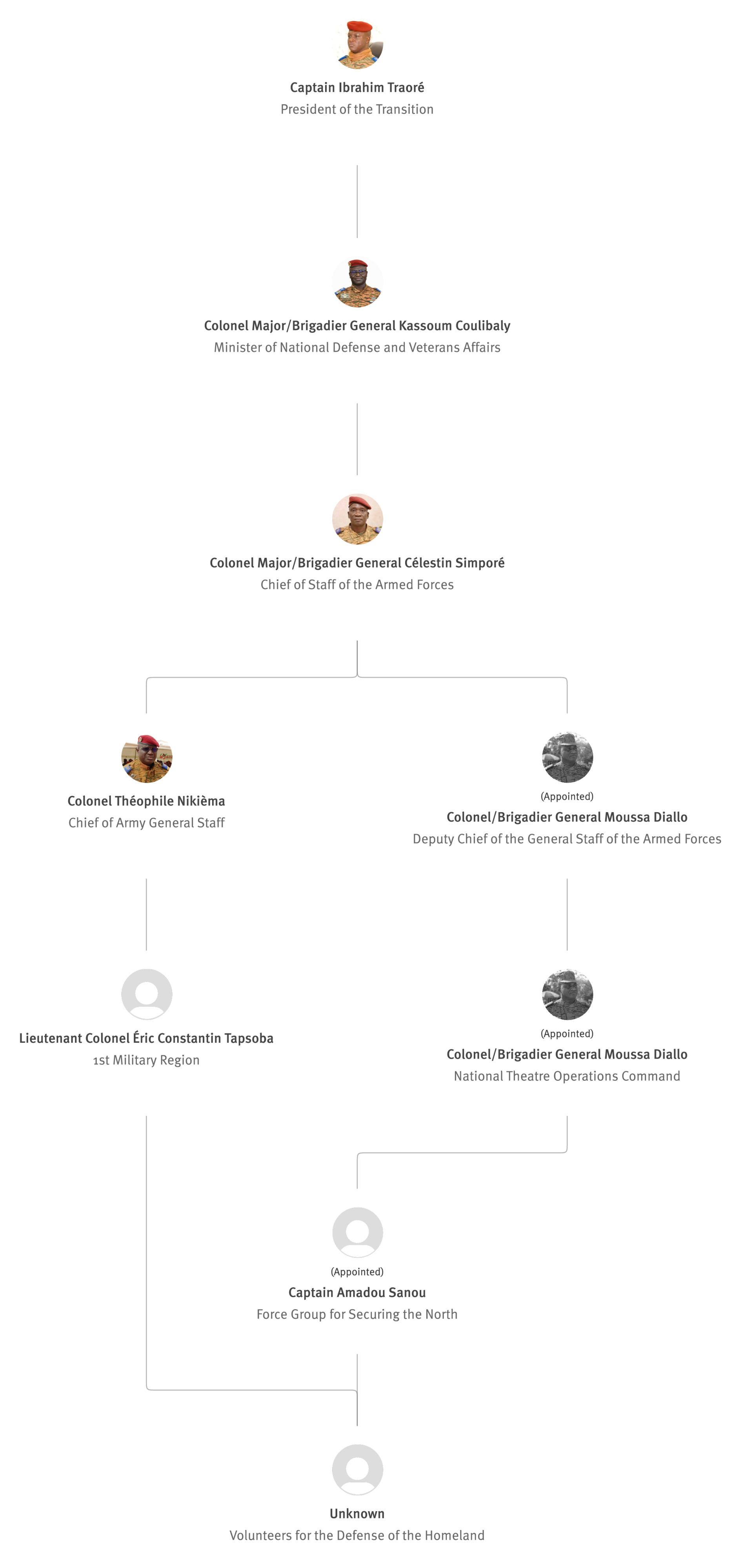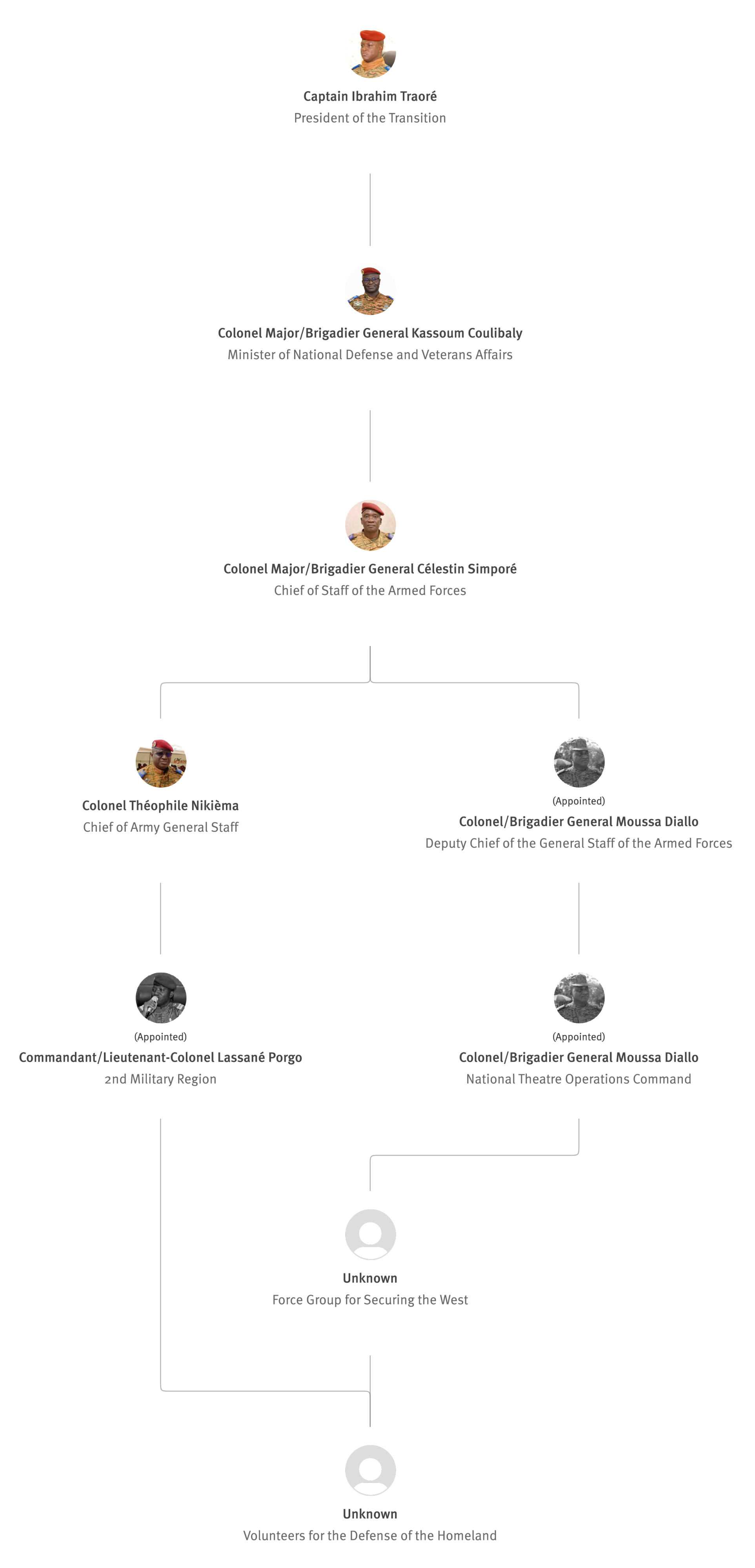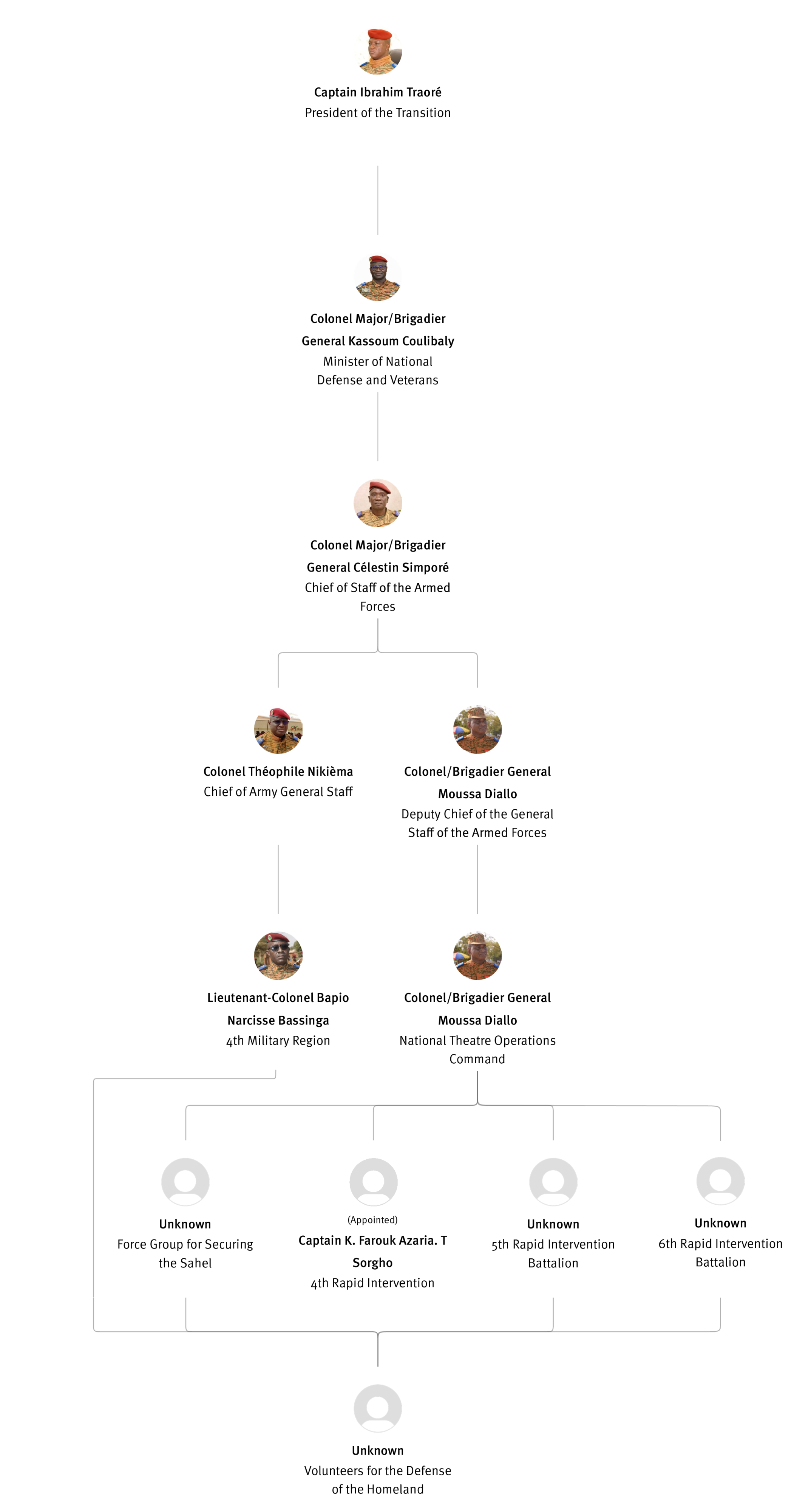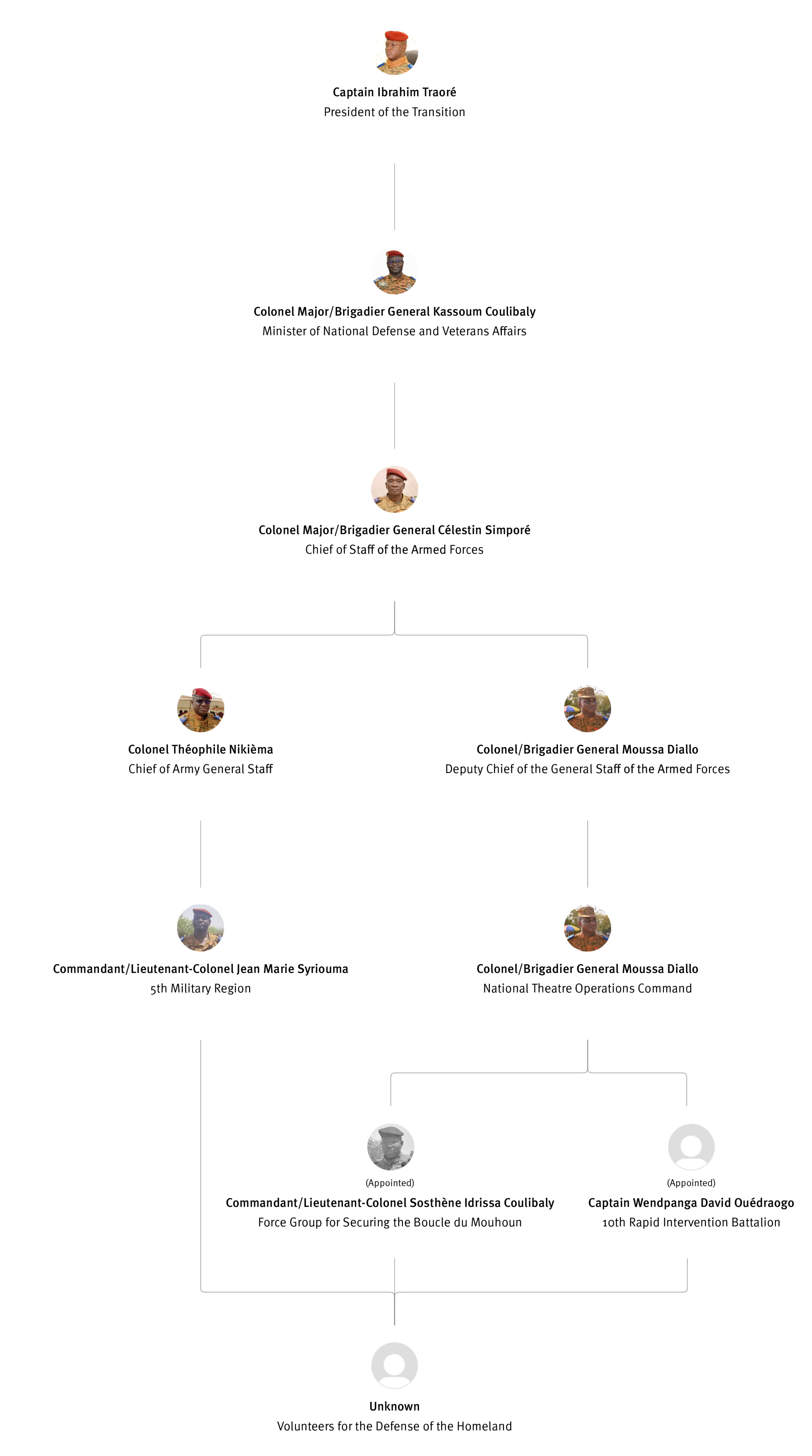 [845] Bernard Kaboré,“Forces armées nationales: le capitaine Ibrahim Traoré procède à des nominations,” L'Observateur Paalga, July 2, 2023, https://web.archive.org/web/20250505172145/https://www.lobspaalga.com/2023/07/02/forces-armees-nationales-le-capitaine-ibrahim-traore-procede-a-des-nominations/ (accessed March 16, 2026). Carine P. Zongo, “Burkina Faso : des nominations dans l’Armée,” 24heures.bf, July 2, 2023, https://web.archive.org/web/20240228164204/https://www.24heures.bf/burkina-faso-des-nominations-dans-larmee/ (accessed September 12, 2025).