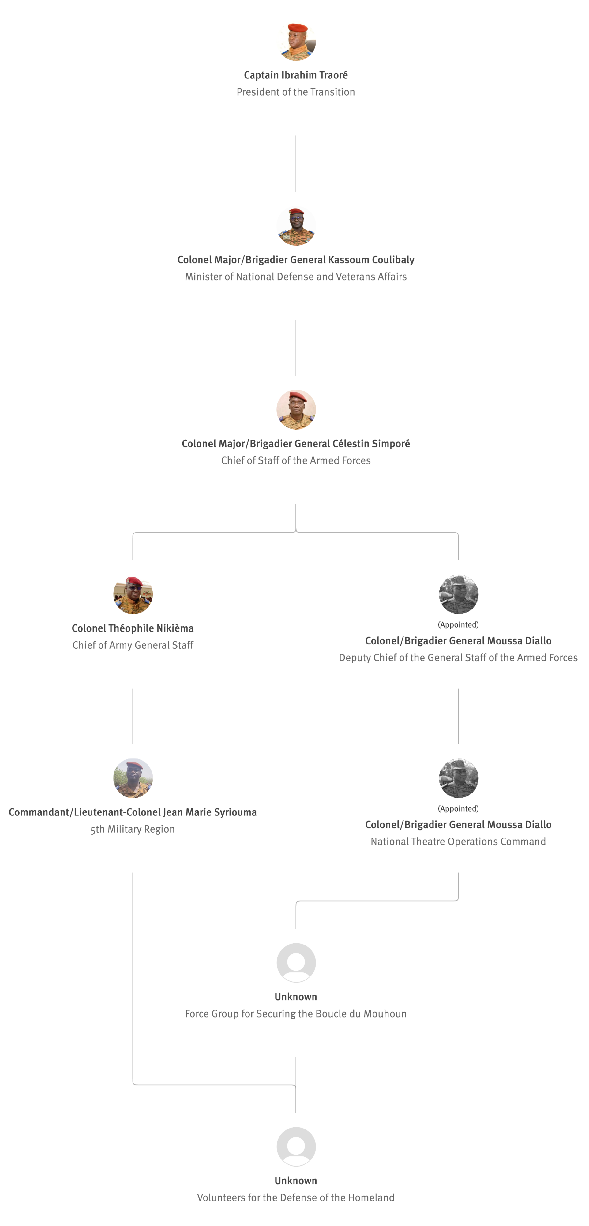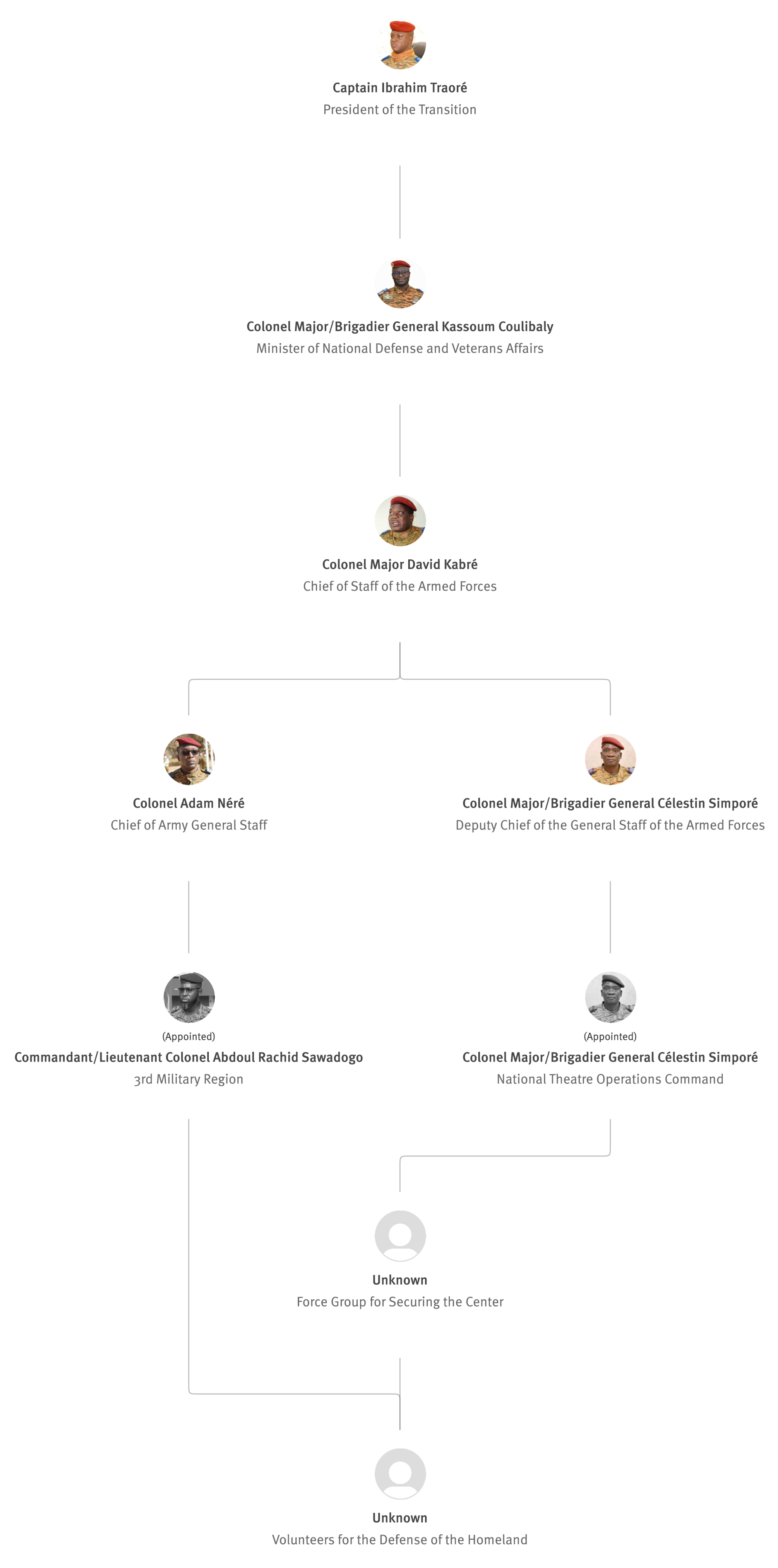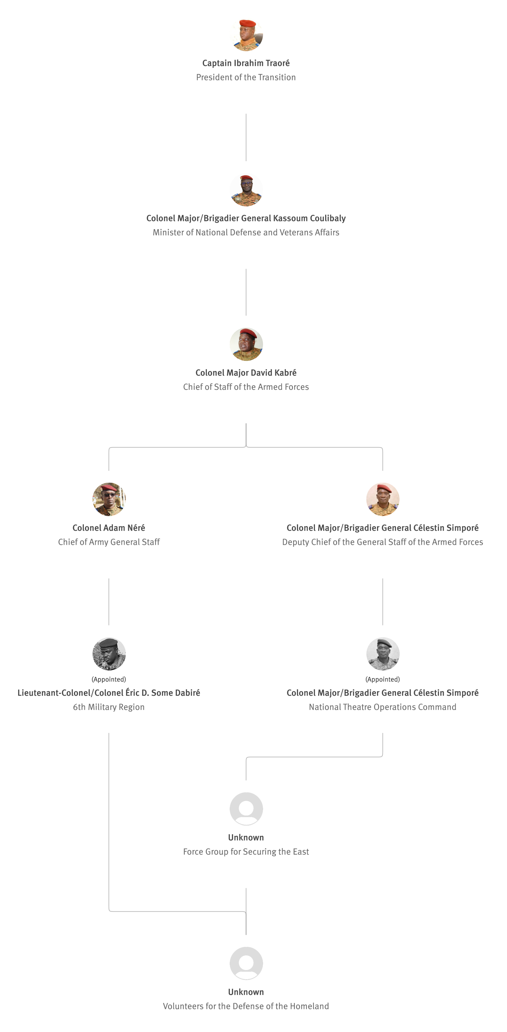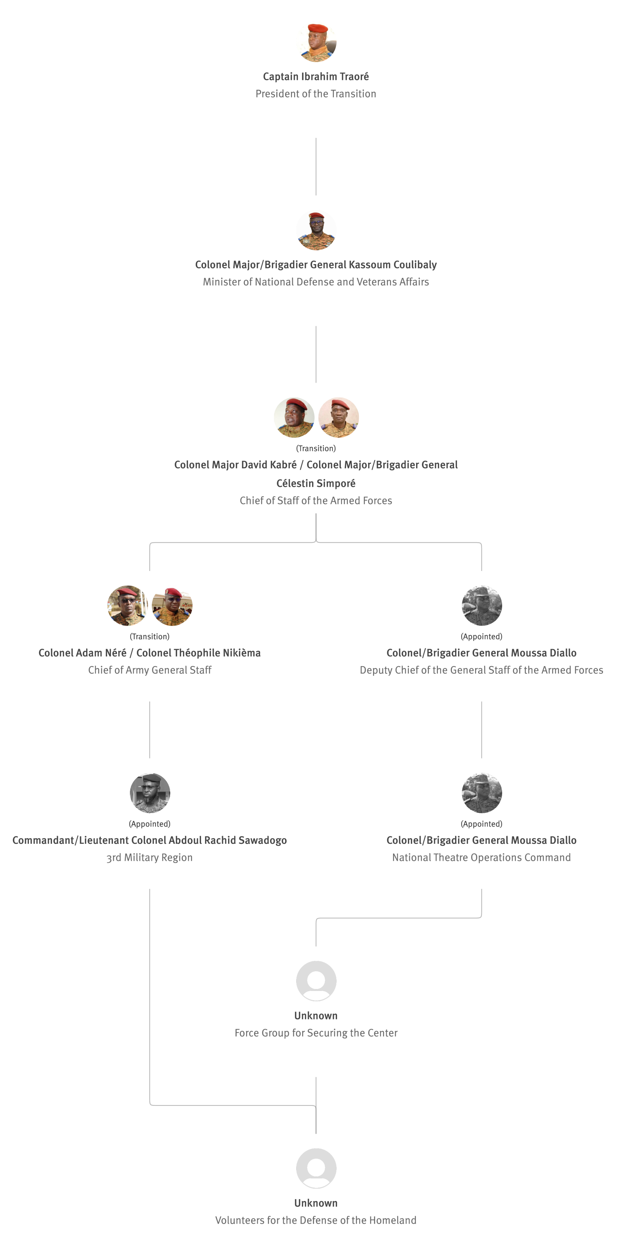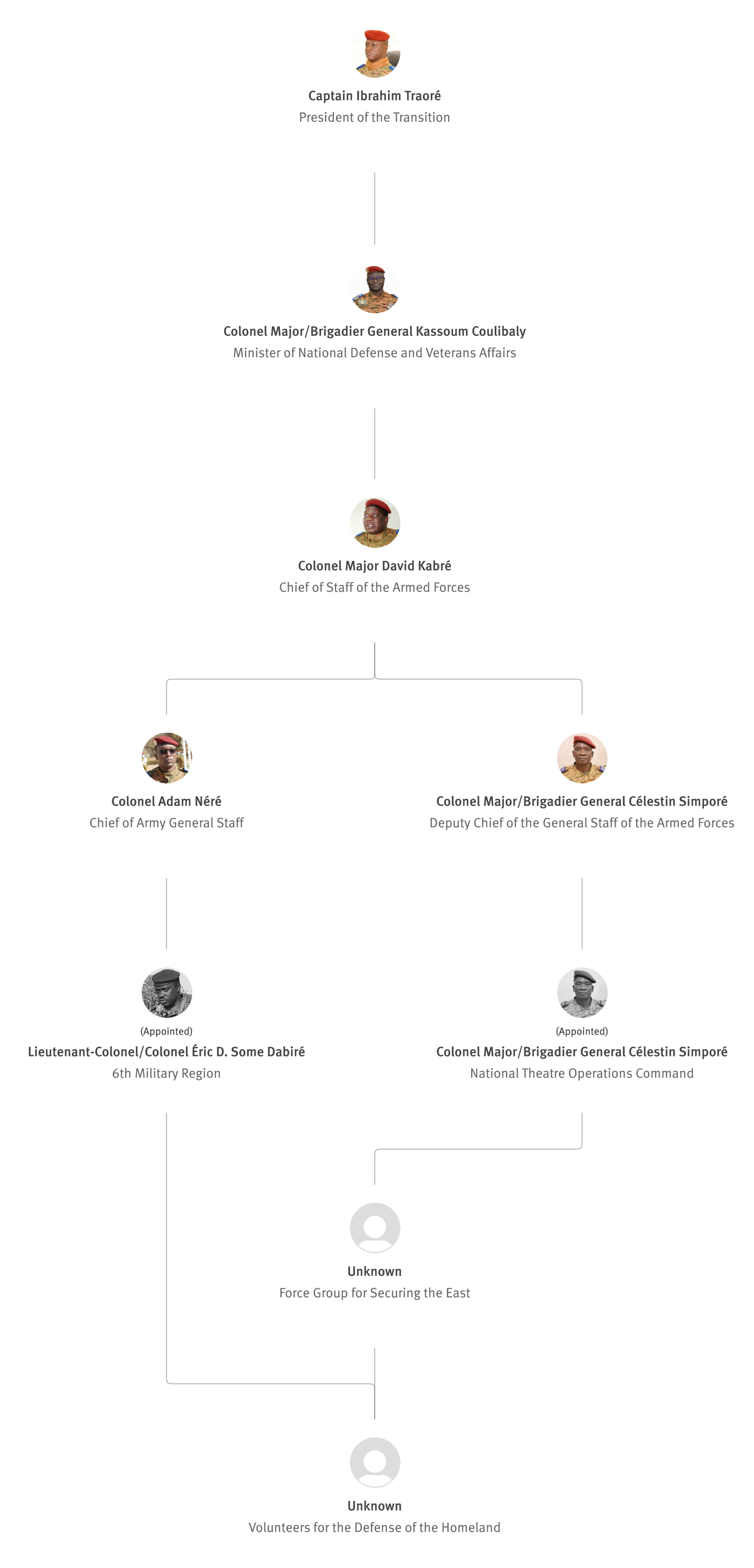 [845] Bernard Kaboré,“Forces armées nationales: le capitaine Ibrahim Traoré procède à des nominations,” L'Observateur Paalga, July 2, 2023, https://web.archive.org/web/20250505172145/https://www.lobspaalga.com/2023/07/02/forces-armees-nationales-le-capitaine-ibrahim-traore-procede-a-des-nominations/ (accessed March 16, 2026). Carine P. Zongo, “Burkina Faso : des nominations dans l’Armée,” 24heures.bf, July 2, 2023, https://web.archive.org/web/20240228164204/https://www.24heures.bf/burkina-faso-des-nominations-dans-larmee/ (accessed September 12, 2025).