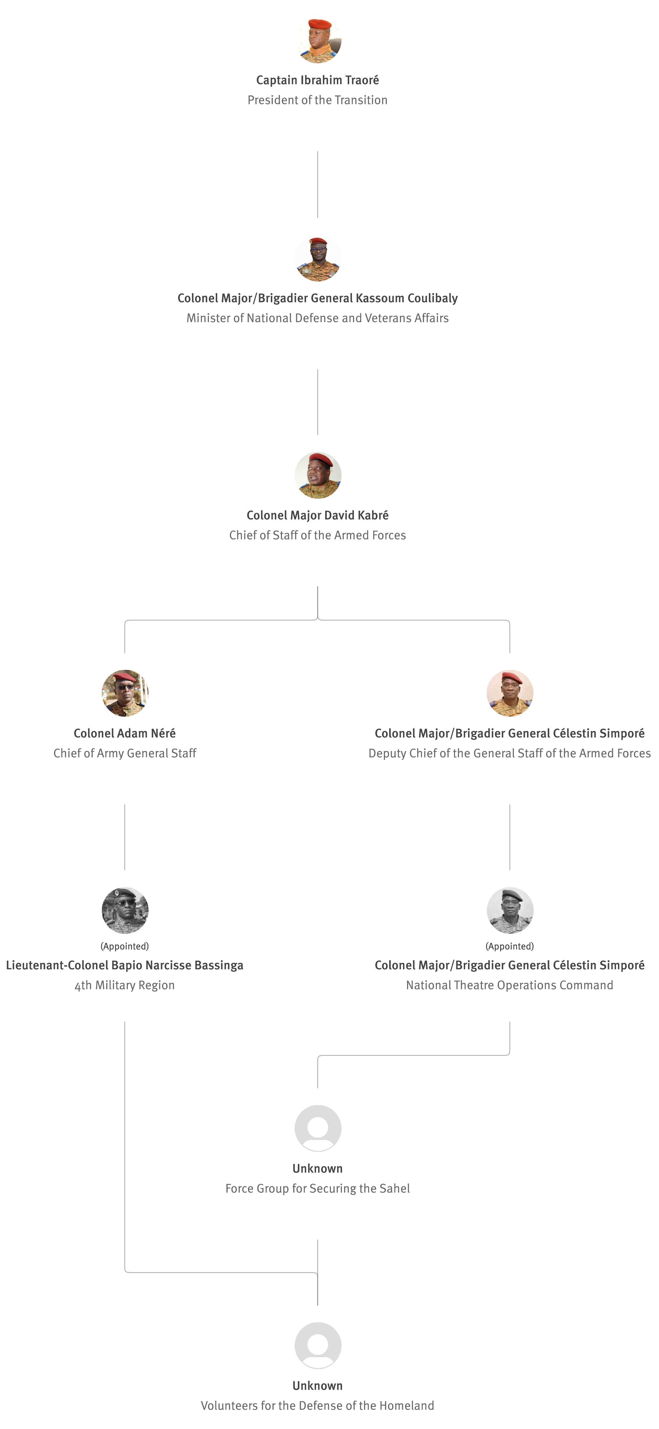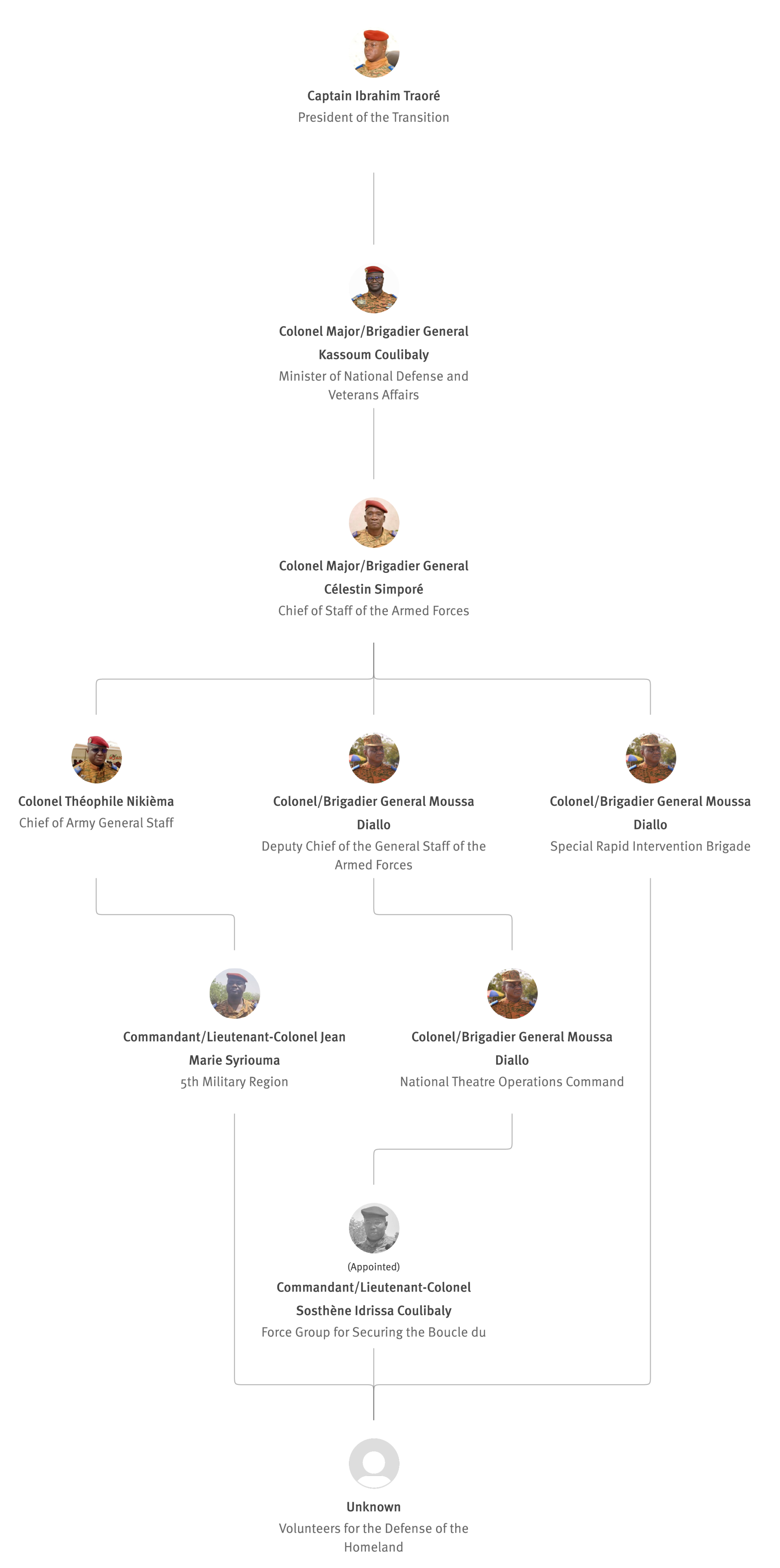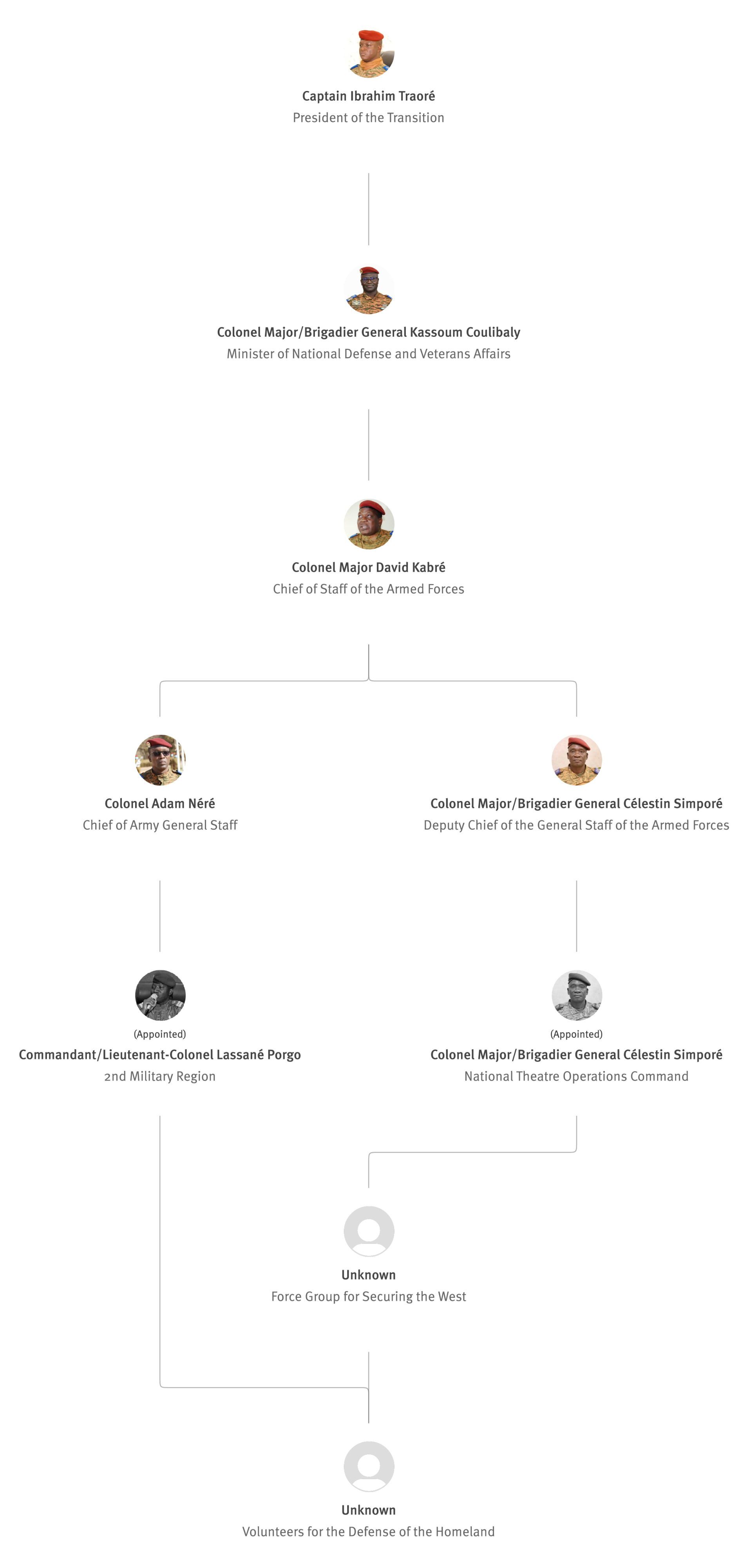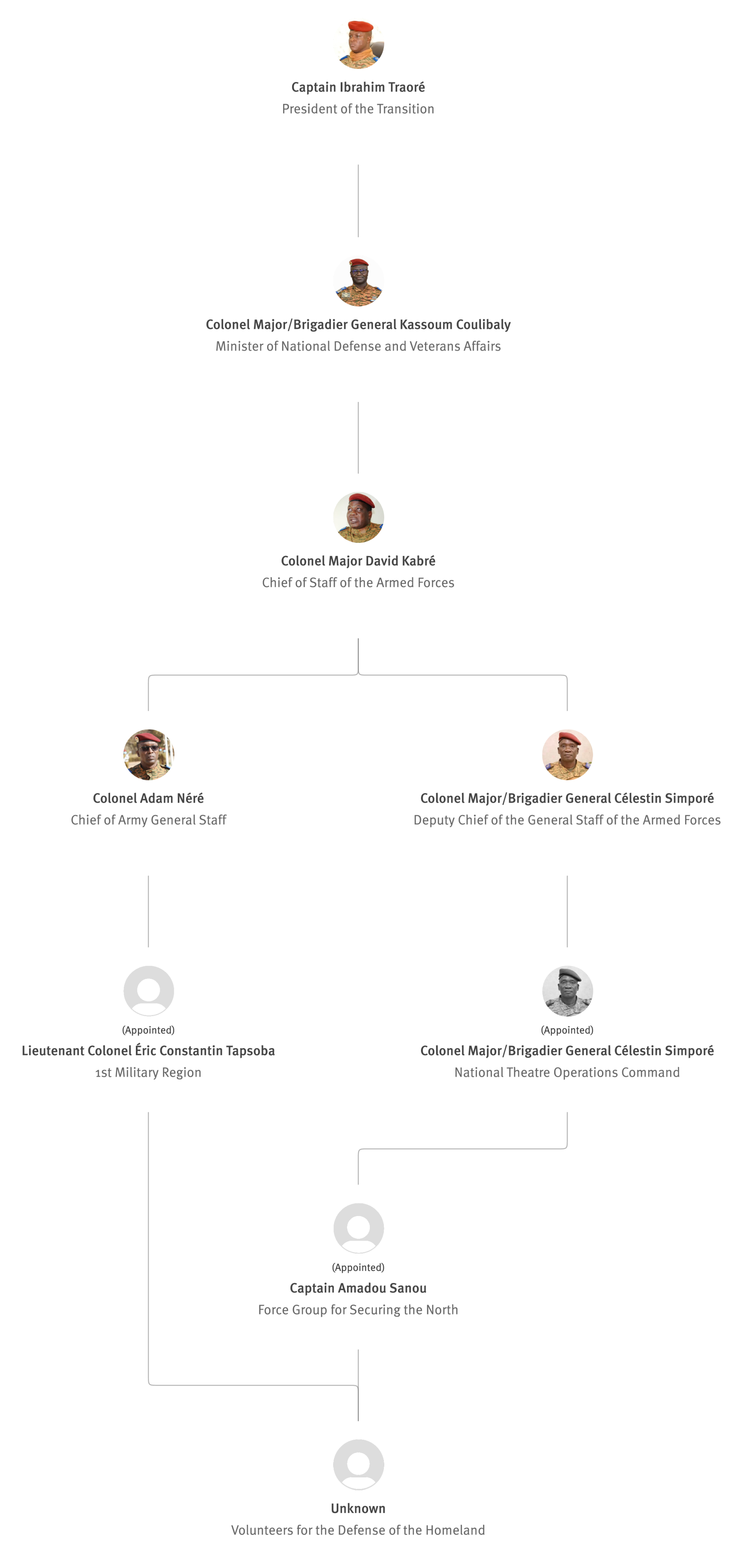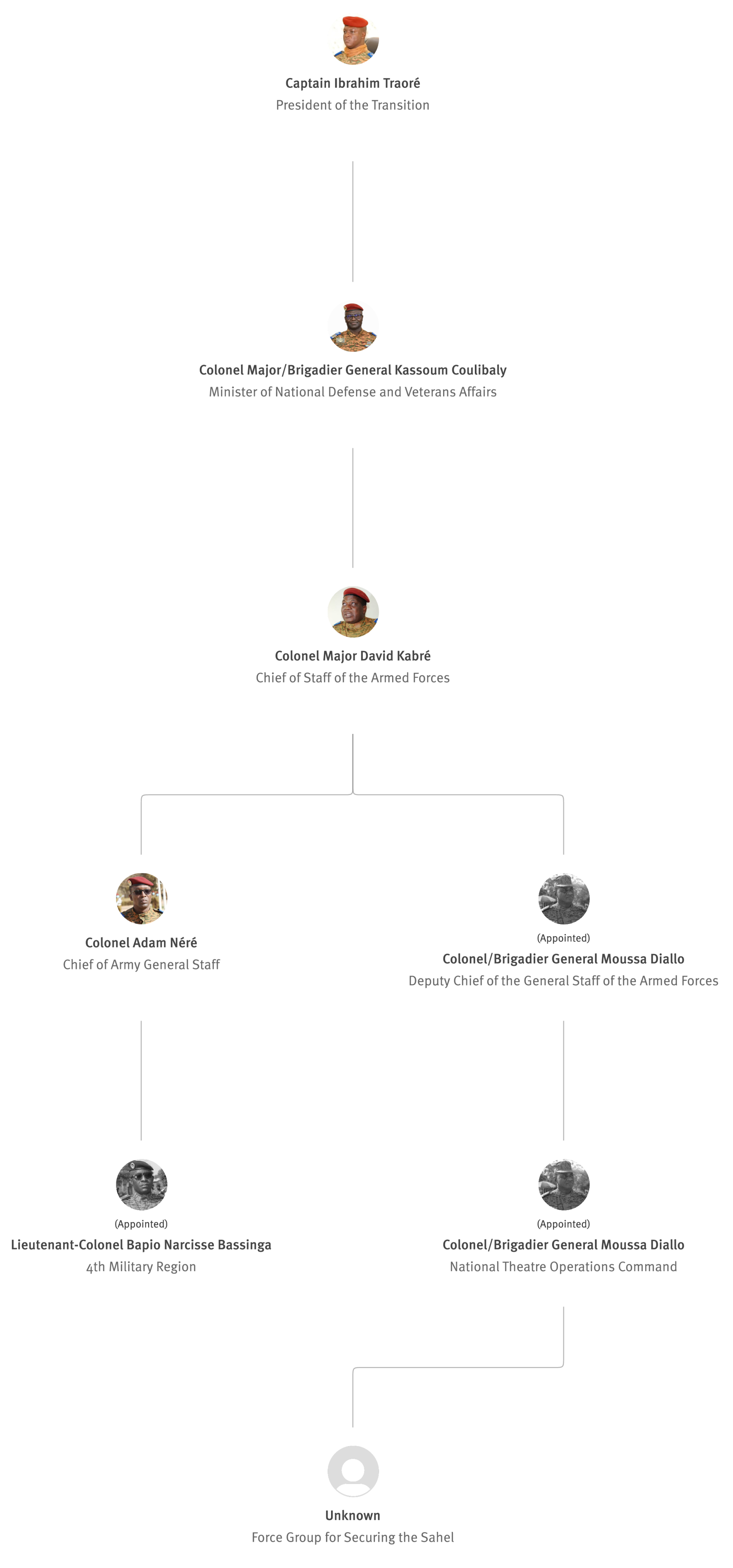 [845] Bernard Kaboré,“Forces armées nationales: le capitaine Ibrahim Traoré procède à des nominations,” L'Observateur Paalga, July 2, 2023, https://web.archive.org/web/20250505172145/https://www.lobspaalga.com/2023/07/02/forces-armees-nationales-le-capitaine-ibrahim-traore-procede-a-des-nominations/ (accessed March 16, 2026). Carine P. Zongo, “Burkina Faso : des nominations dans l’Armée,” 24heures.bf, July 2, 2023, https://web.archive.org/web/20240228164204/https://www.24heures.bf/burkina-faso-des-nominations-dans-larmee/ (accessed September 12, 2025).