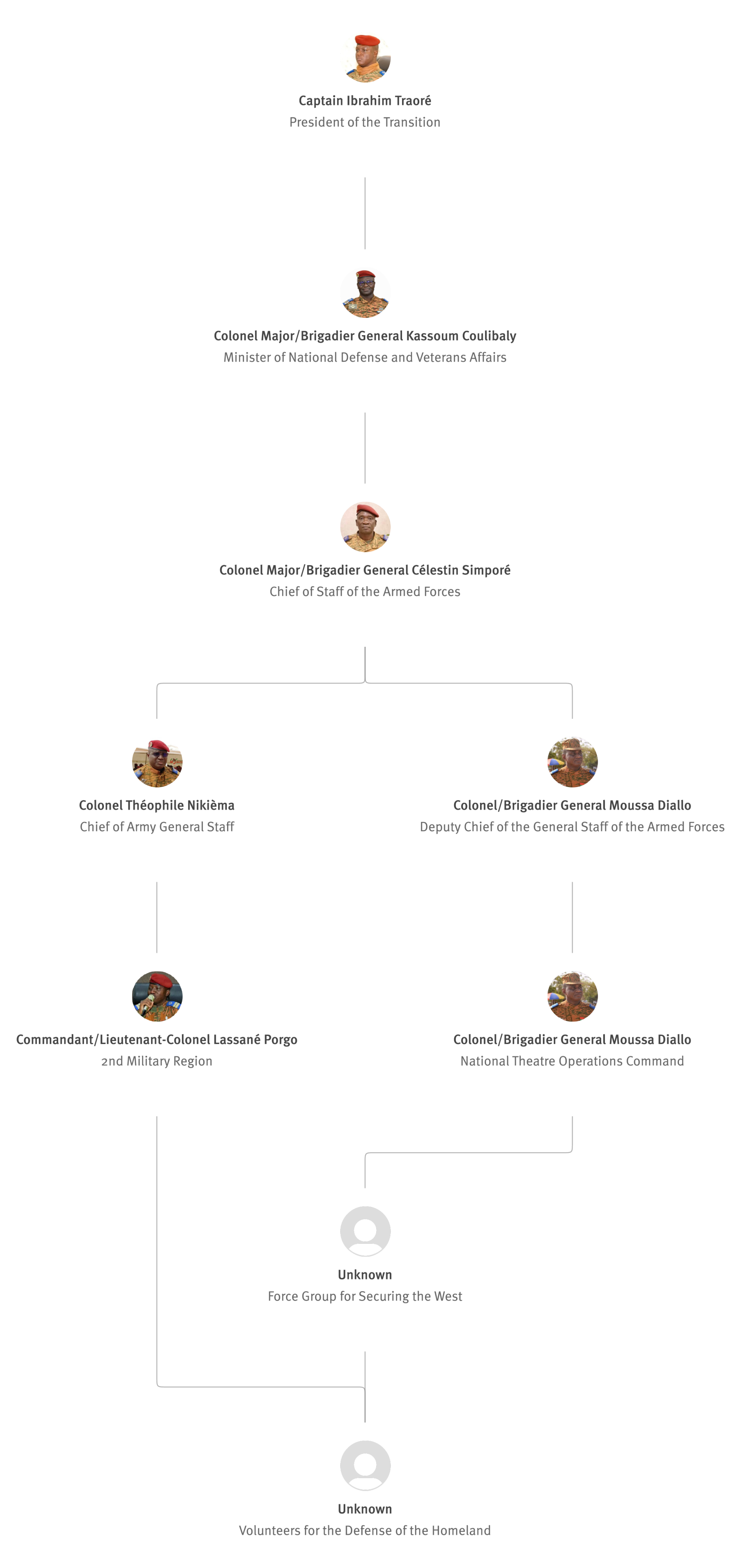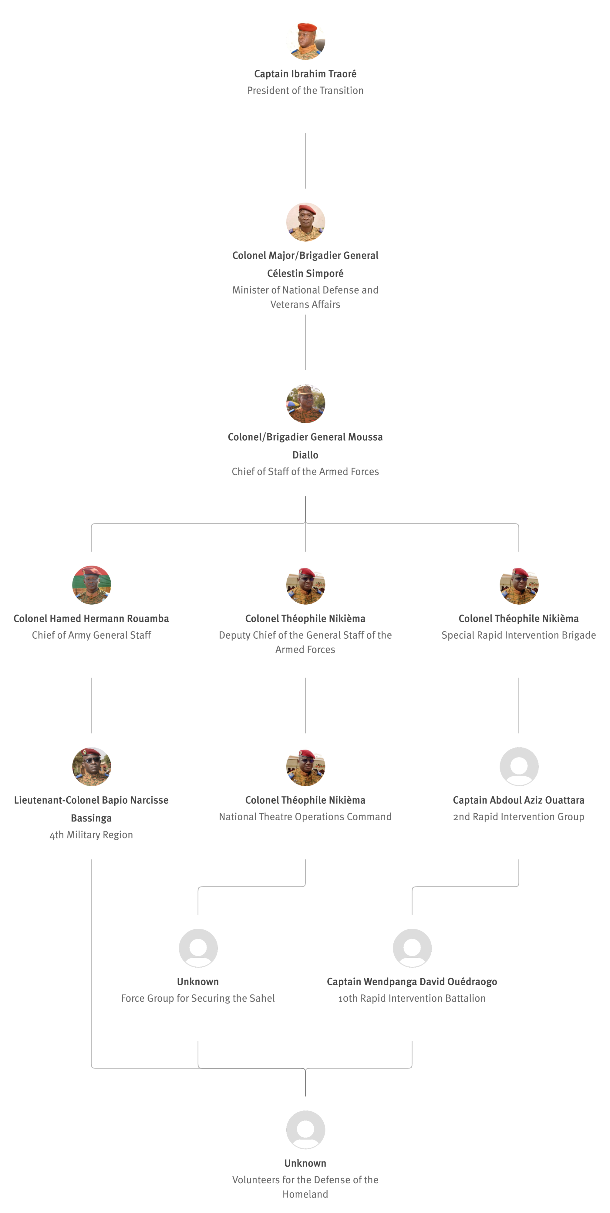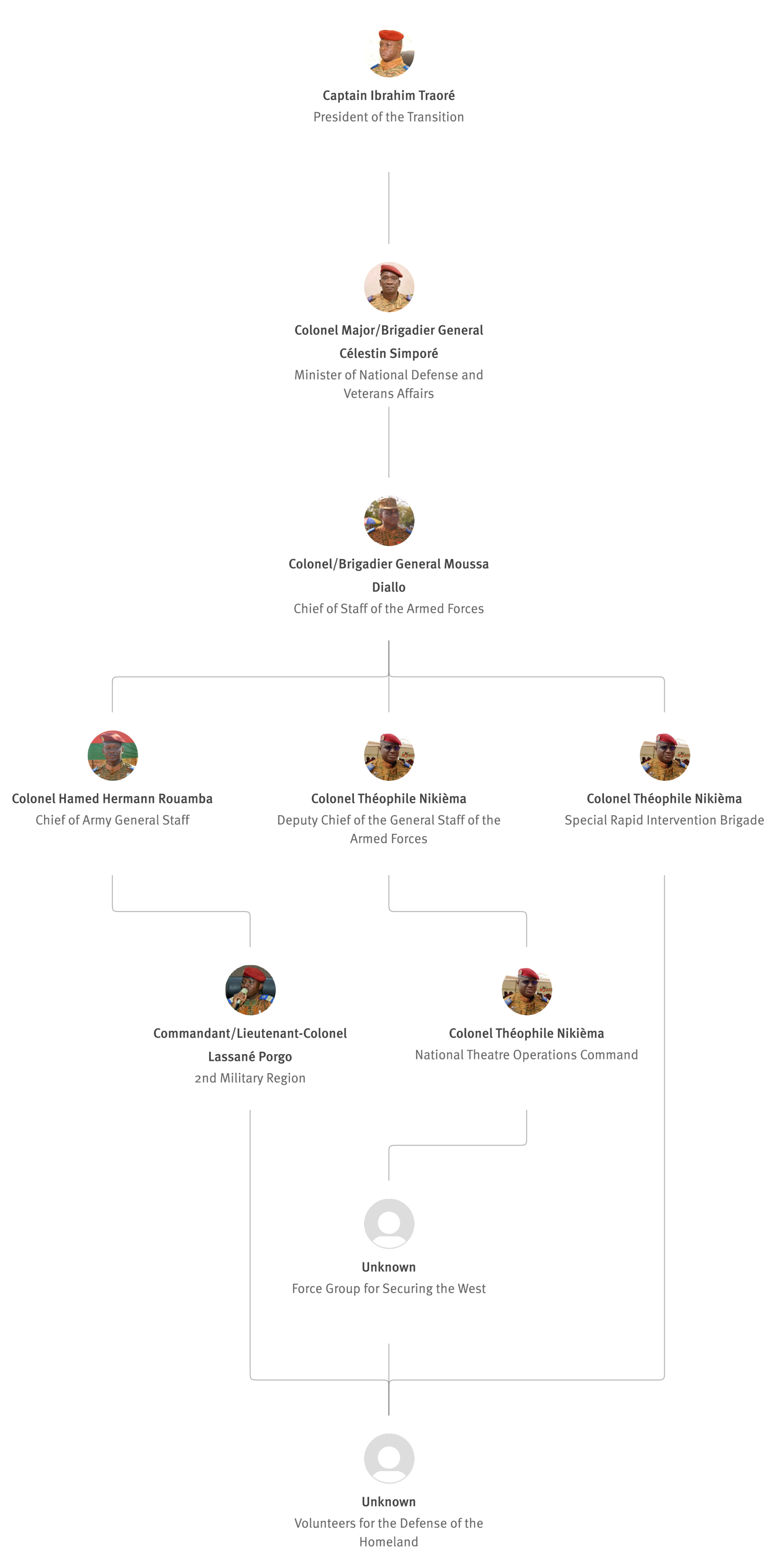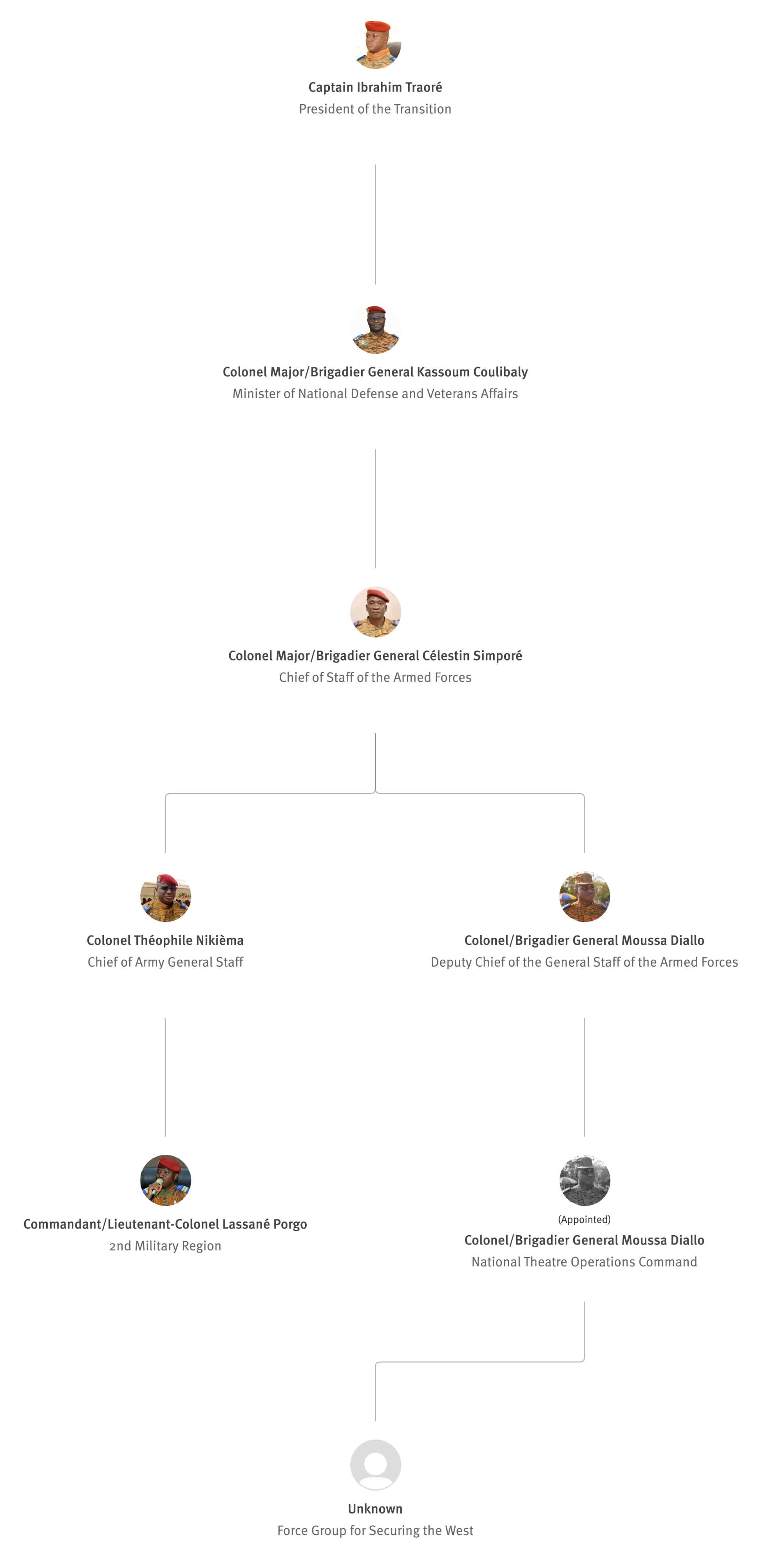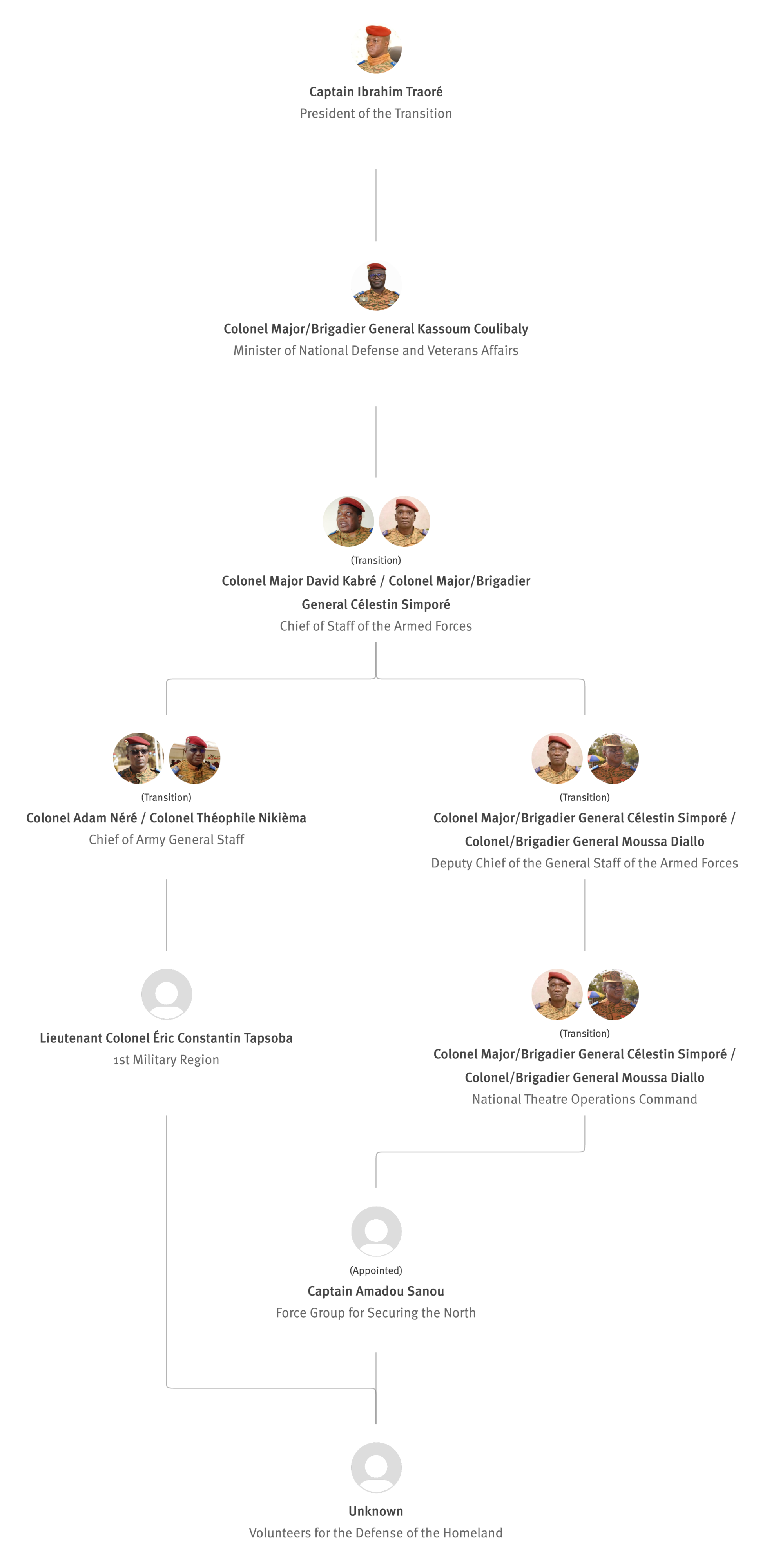 [845] Bernard Kaboré,“Forces armées nationales: le capitaine Ibrahim Traoré procède à des nominations,” L'Observateur Paalga, July 2, 2023, https://web.archive.org/web/20250505172145/https://www.lobspaalga.com/2023/07/02/forces-armees-nationales-le-capitaine-ibrahim-traore-procede-a-des-nominations/ (accessed March 16, 2026). Carine P. Zongo, “Burkina Faso : des nominations dans l’Armée,” 24heures.bf, July 2, 2023, https://web.archive.org/web/20240228164204/https://www.24heures.bf/burkina-faso-des-nominations-dans-larmee/ (accessed September 12, 2025).