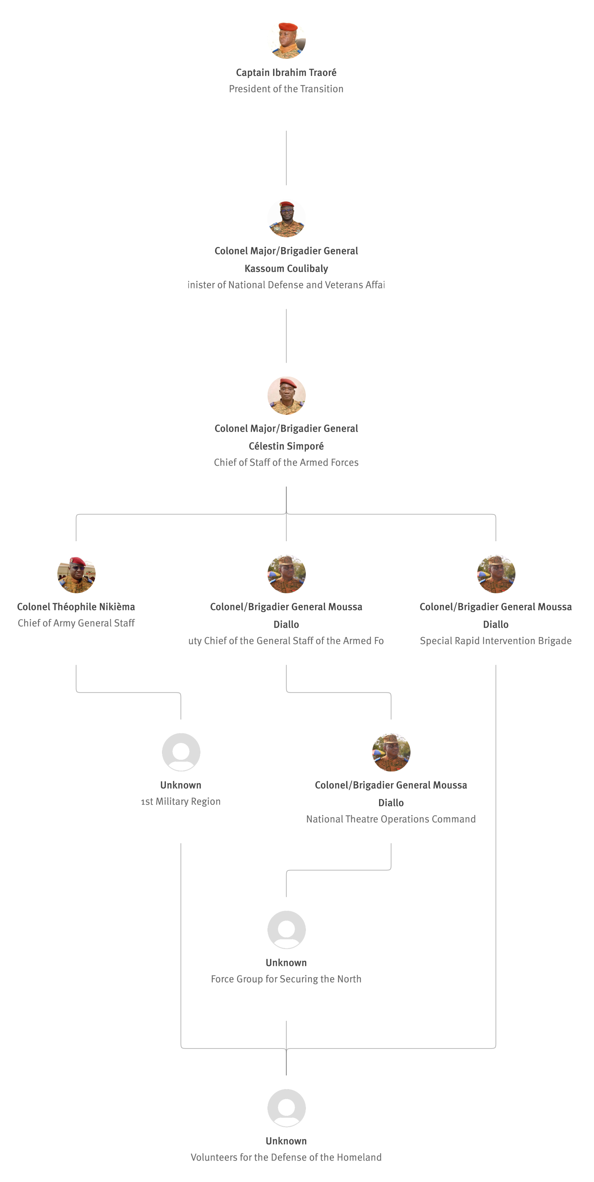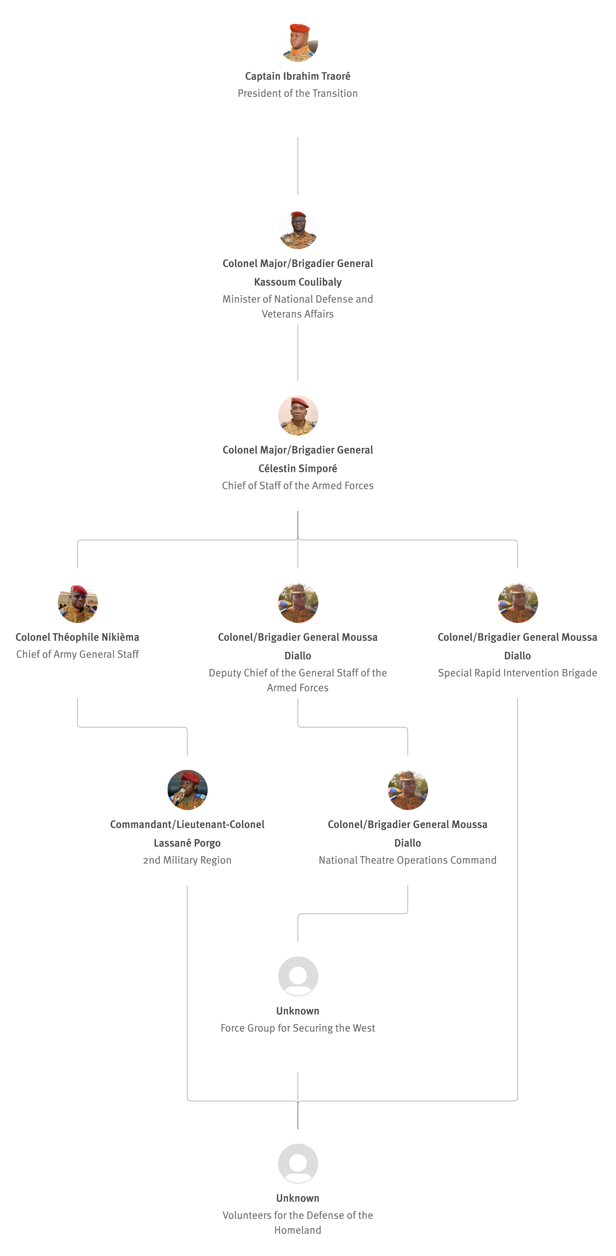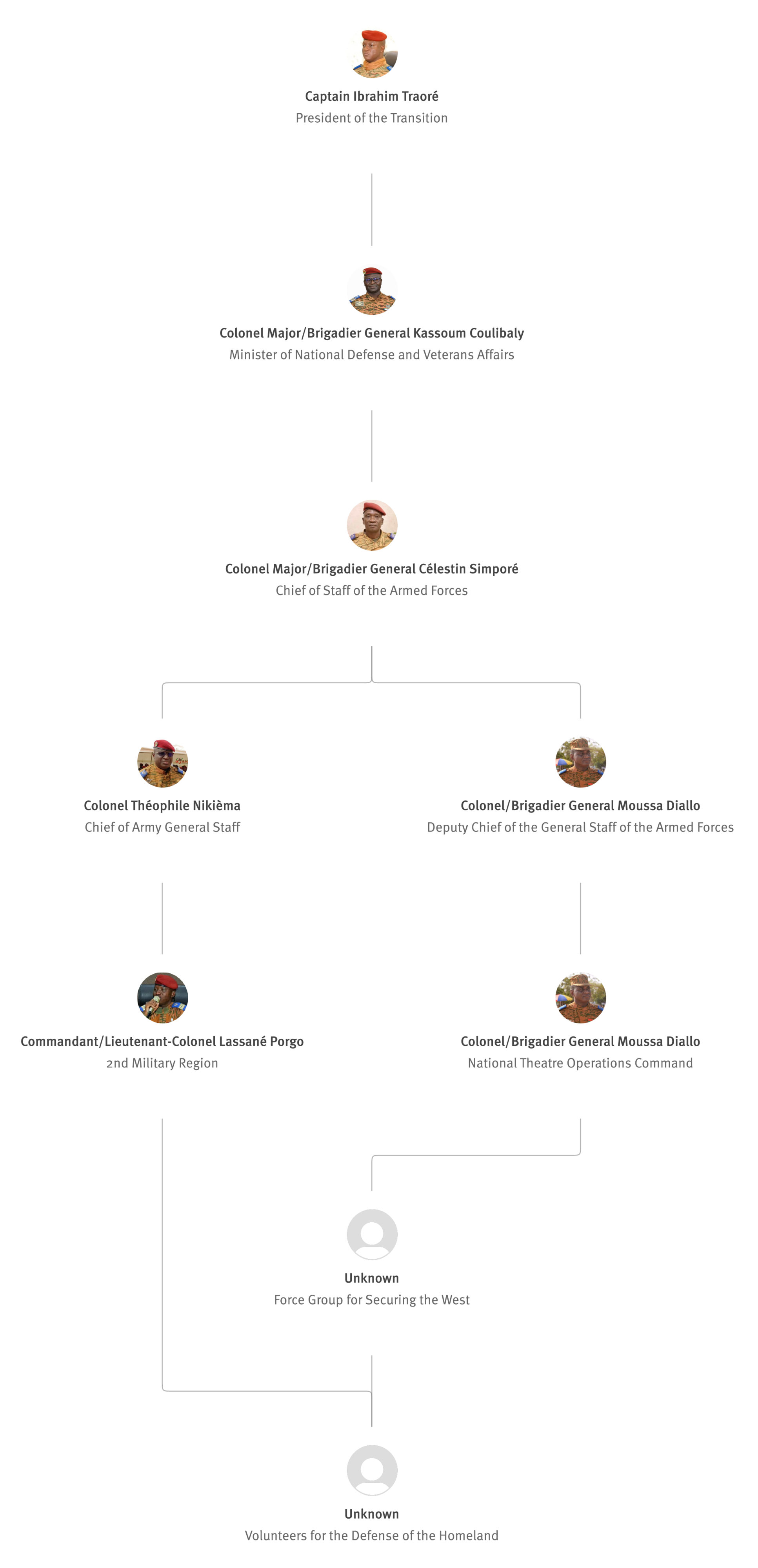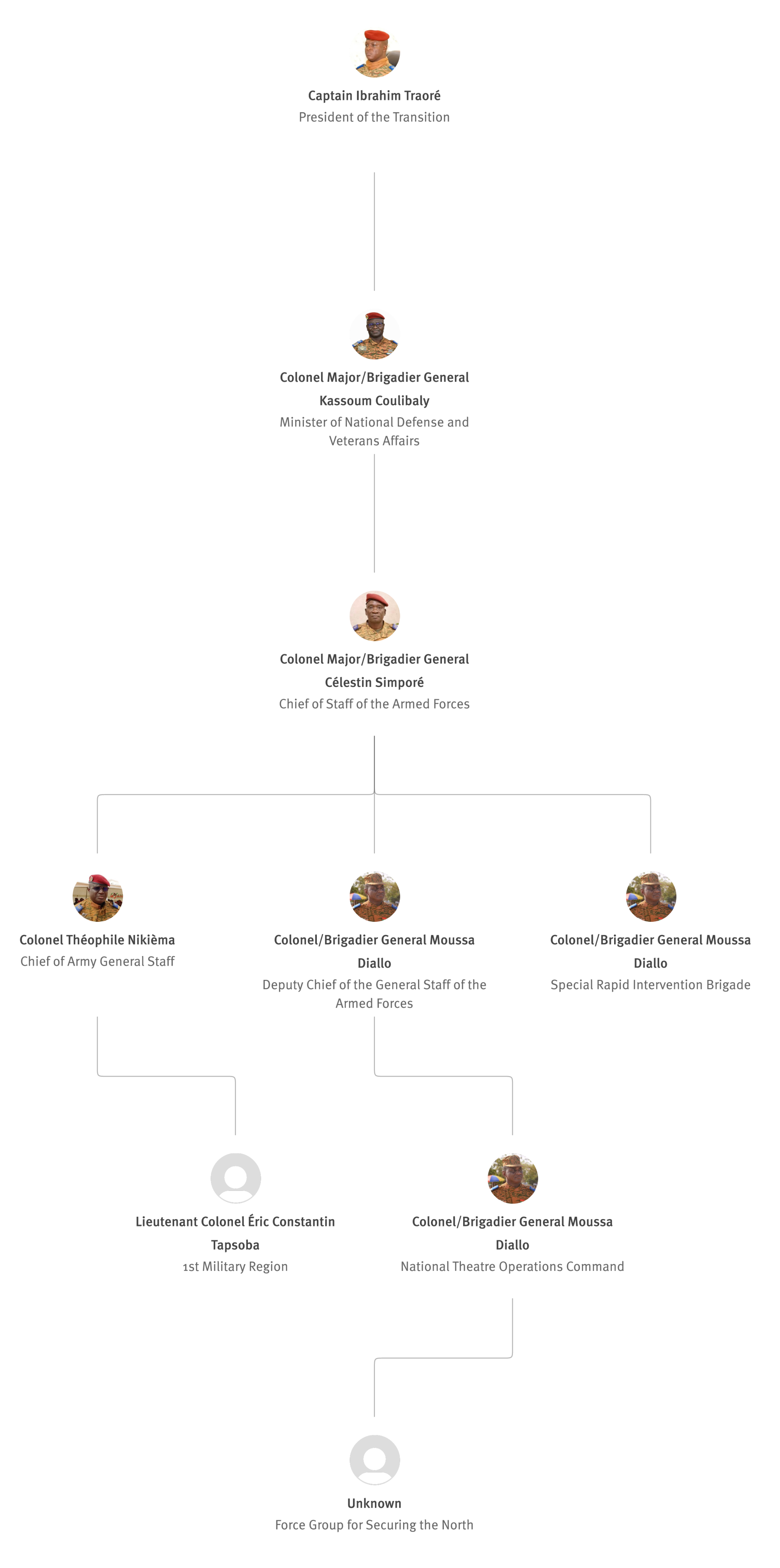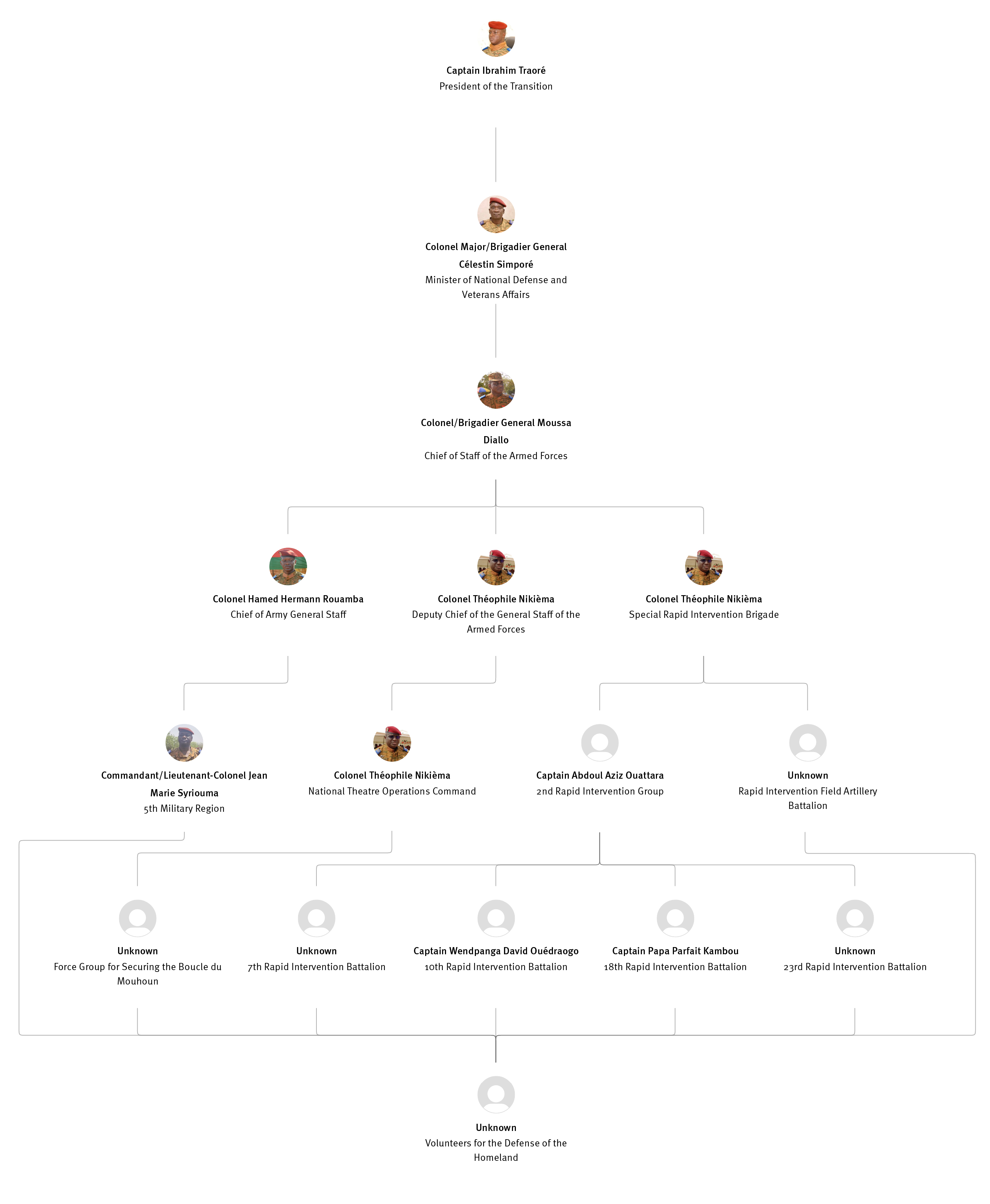 [852] Bernard Kaboré, “Forces armées nationales : le capitaine Ibrahim Traoré procède à des nominations,” L’Observateur Paalga, July 2, 2023, https://web.archive.org/web/20250505172145/https://www.lobspaalga.com/2023/07/02/forces-armees-nationales-le-capitaine-ibrahim-Traoré-procede-a-des-nominations/ (accessed September 12, 2025). Carine P. Zongo, “Burkina Faso: des nominations dans l’Armée,” 24heures.bf, July 2, 2023, https://web.archive.org/web/20240228164204/https://www.24heures.bf/burkina-faso-des-nominations-dans-larmee/ (accessed September 12, 2025).