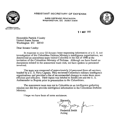 Letter of March 11, 1996 from Acting Assistant Secretary of Defense Frederick Smith to Senator Patrick J. Leahy, concerning U.S. mission to evaulate and recommend changes in the Colombian military intelligence system.